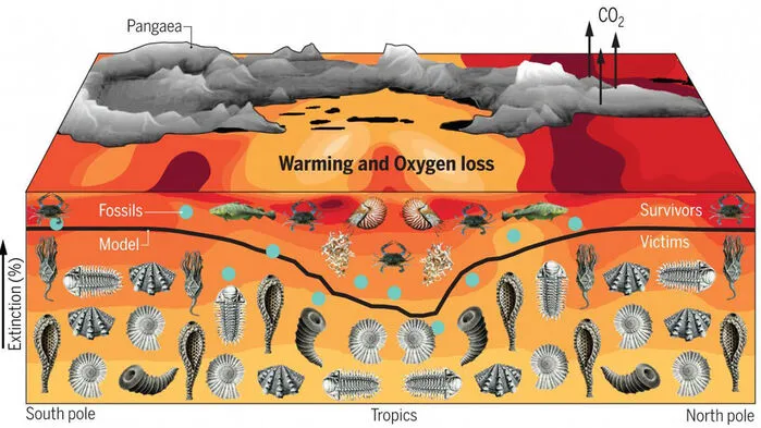 이 대멸종의 주요 원인으로는 온실가스의 대량 방출에 따른 급격한 기후 변화, 해양 산소 고갈, 그리고 해양 산성화가 지목된다.