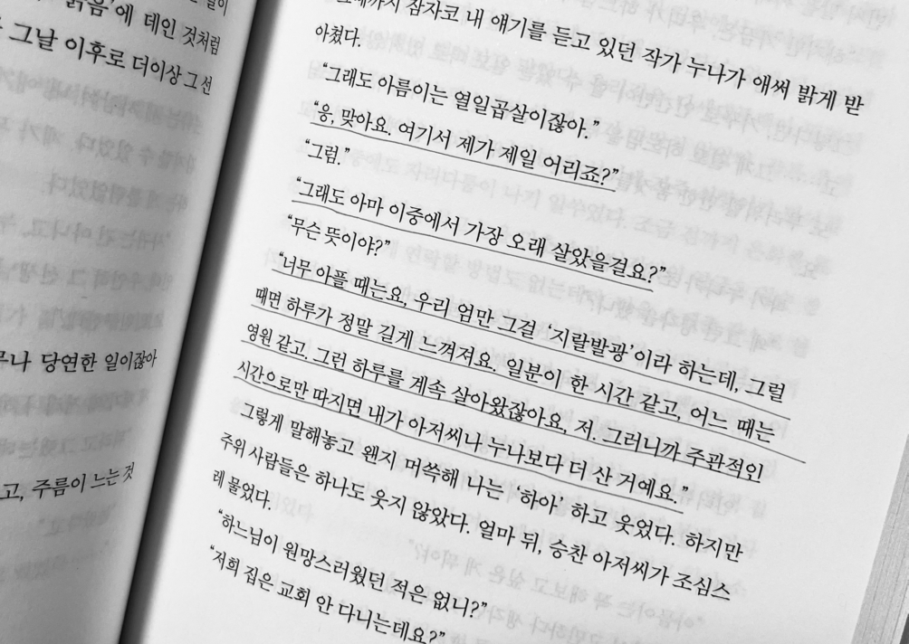 김애란의 <두근두근 내 인생>은 불치의 병 앞에서 죽음으로 향하는 한 가족의 이야기이다. 모두가 결국 돌고 돌아 죽음으로 흐르는 게 인생이라지만 나을 수 없는 병 앞에서 급속도로 가까워지는 죽음이 두려운 이유는 내가 죽음을 향해 움직이는 것이 아니라 그것이 내게로 뛰어오는 것처럼 느껴지기 때문일 테다.