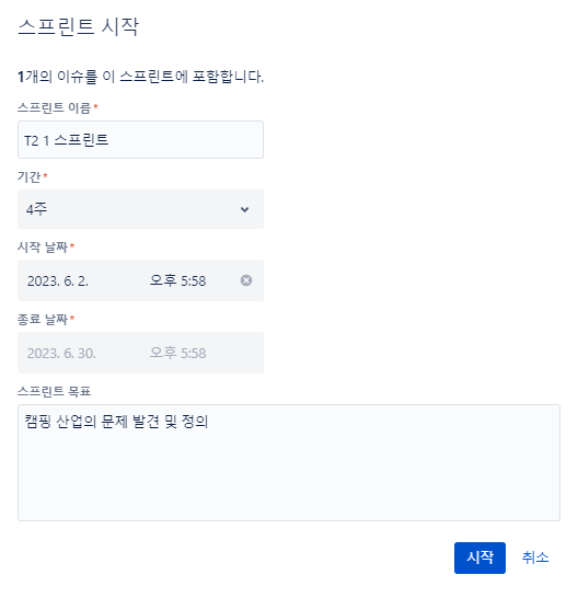 - 스프린트를 시작하면 기간을 설정할 수 있는 화면으로 이동하게 되고, 여기서 기간은 1주단위로 설정가능하면 최대 4주까지는 화면에서 바로 선택할 수 있도록 메뉴가 구성되어 있다. 기간을 선택해 시작날짜를 입력하면 종료날짜는 자동으로 셋팅이 되어 진다. 4주를 초과하는 기간은 사용자 지정을 눌러 설정이 가능하다.