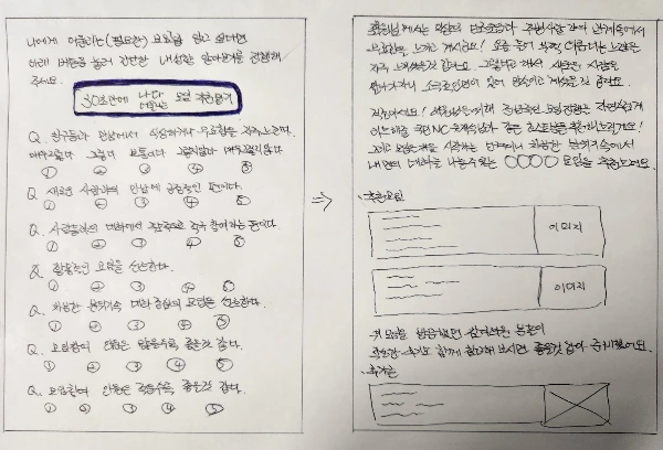 응답결과 통해 5가지 성향 분석 결과지 제공, 추천모임은 2분류로 나뉘어 적극적 외향형/ 소극적 내향형 등으로 구분해 성향분석에 따른 추천모임 제공