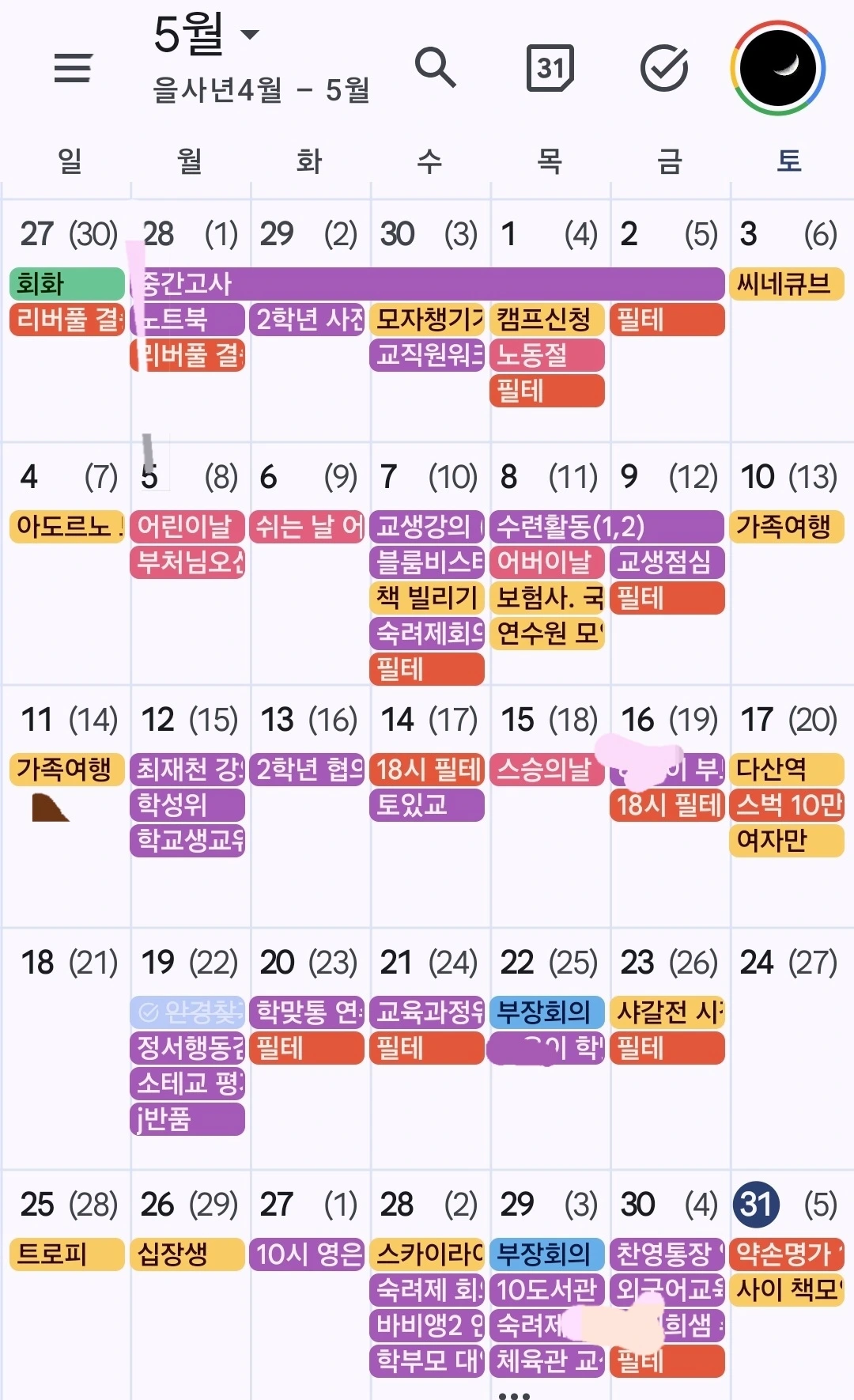 5월부터 본격화된 학생들의 생활문제, 그 처리와 지원를 위한 각종 회의, 한주에 2회 하던 필라테스를 3회로 늘릴 것을 결심한 것, 하지만 집에서 타던 실내자전거를 안하고 있는걸. 5월 10일에 다녀온 엄마 팔순 여행, 그 뒤 이어진 주말 약속. 독서모임 준비. 그러나 일본어를 1주일째 쉬고 있는걸. 3.4월 주말반 다니느라 힘들었던 게 이제 나오나??