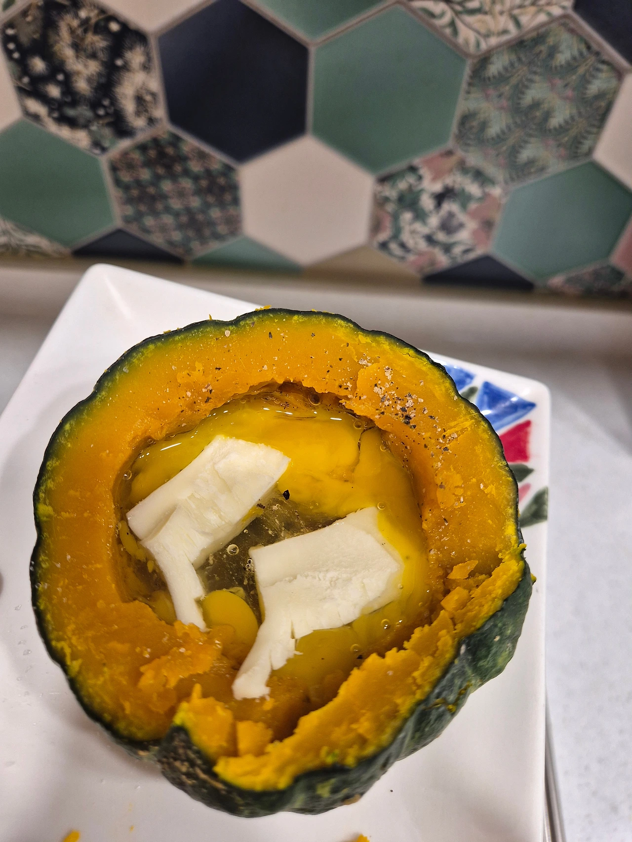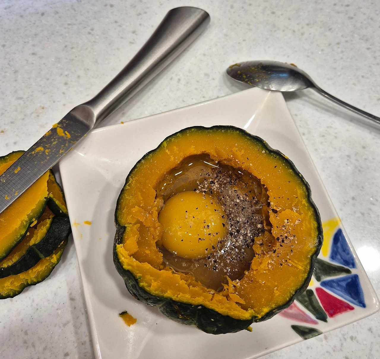 2. 단호박에 달걀하나를 넣고 소금 후추 뿌려 살짝 저어 섞는다. 노른자를 터뜨리는 게 핵심.