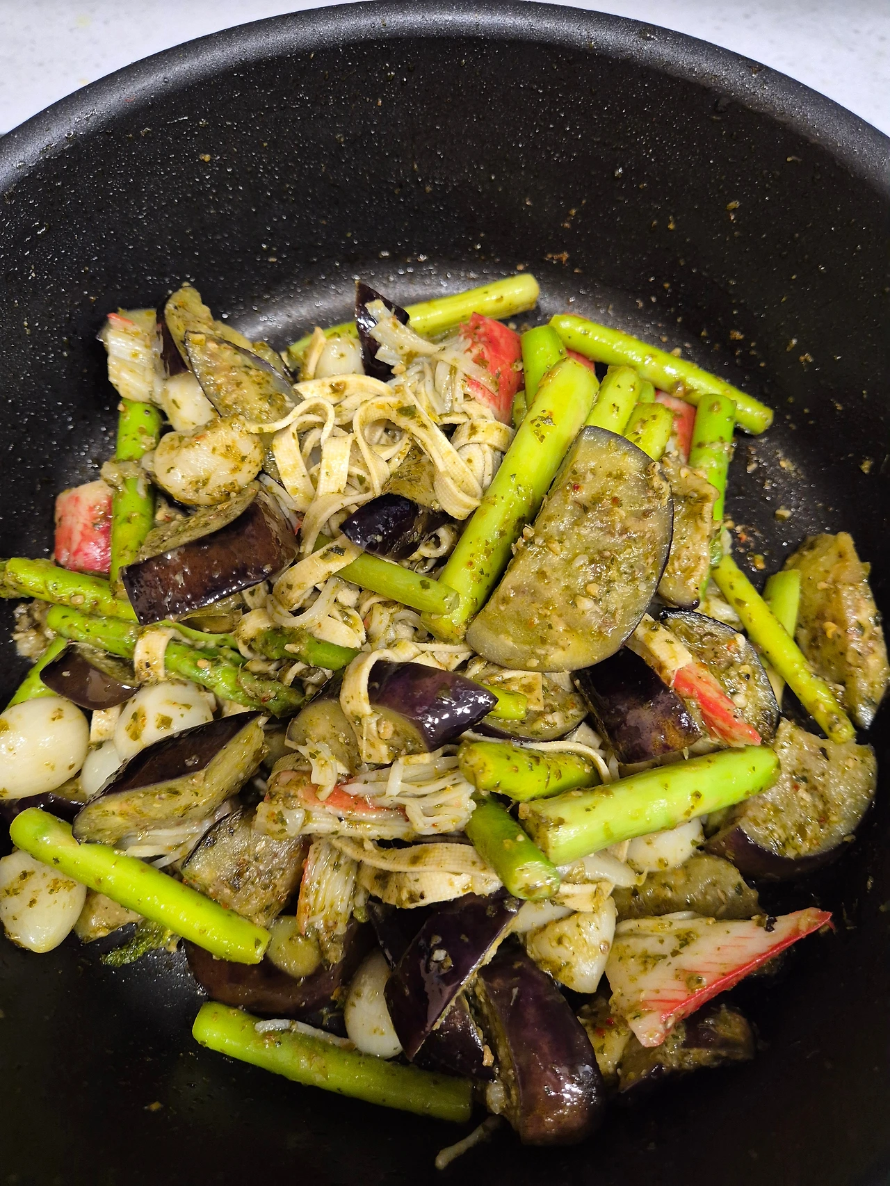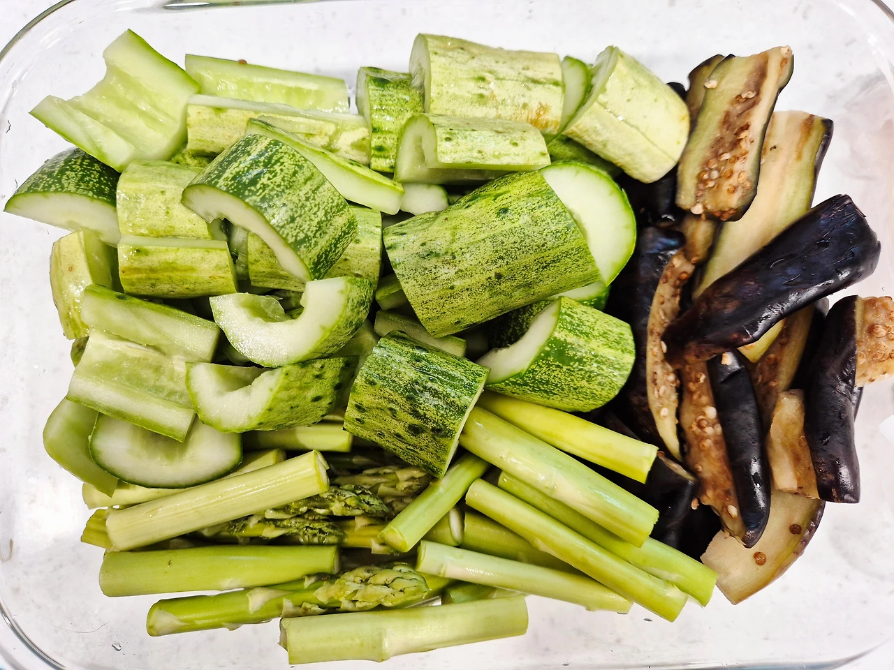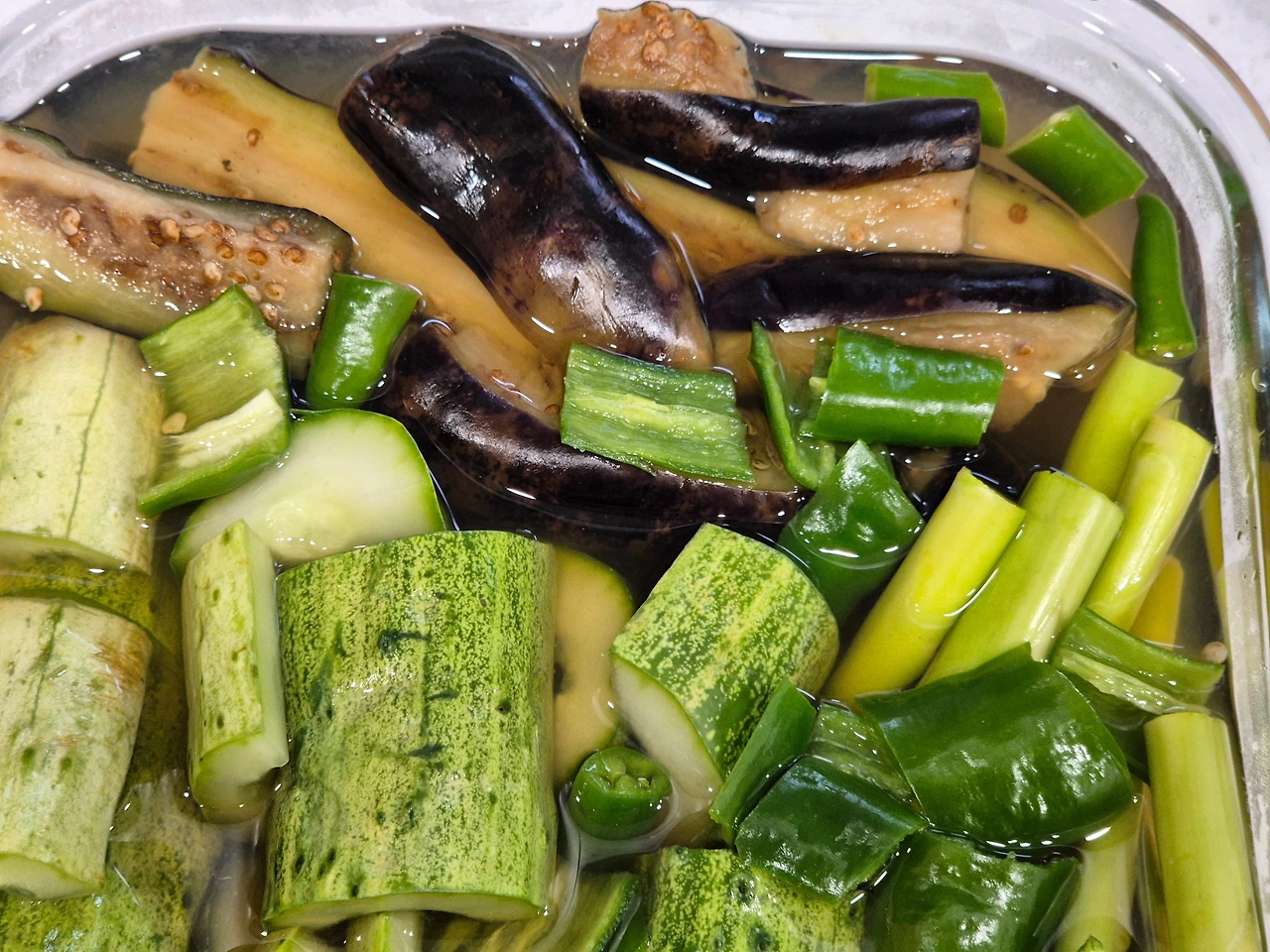 물 800밀리리터에 가쓰오브시와 다시마(다행히 둘 다 있었다)를 넣어 끓이고(여기에 동전으로 생긴 연두 국물내기를 하나 넣었다) 간장(쯔유로 했다) 3스푼, 설탕 3스푼(뭘로 넣을까 하다가 얼마전 새로 구입한 마스코바도 설탕을 넣었다), 식초 2스푼을 넣었다. 베이스를 다시물로 한다는 게 제일 맘에 들었다. 식초, 설탕, 간장을 몇컵씩 들이붓지 않아서 좋았다. 물론 맛도 그만큼 심심하겠지. 끓인 베이스를 살짝 절여 짠 가지, 작게 썬 오이, 4등분한 아스파라거스에 들이부었다.