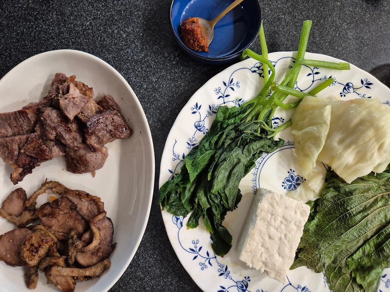 첫 며칠은 싸우고 혼냈는데, 다 소용없다는 걸 알지 않나? 내려놨다. 니 뜻대로 살아야 니 갈 길을 찾겠지. 밥이나 챙겨 먹이자.로 방향 선회. 한살림에서 주문한 호박잎이 왔길래 쪄서 아침부터 호박잎, 양배추, 깻잎쌈에 두부, 소고기(아들꺼), 오리고기(내꺼) 를 먹었다. 한동안 고기를 안먹어서 오리고기를 먹는 게 내 뜻이었으나, 역시 오리고기는 나에게 안맞는다. 찐두부가 오히려 맛있었다. 나의 특제 쌈장이 맛있었다. 된장, 고추장, 미소된장, 마늘 + 아몬드버터 잔뜩 으로 만들어서 짜거나 달지 않아서 좋다.