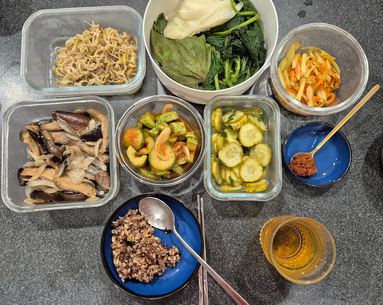 샌드위치를 종이호일로 싸는 일이 영 어려웠는데, 이번엔 유튜브를 찾아 터득하고야 말았다. 아들 것은 준비완료했으니, 나는 전날 만든 야채 반찬들을 꺼내 잡곡밥을 아주 맛나게 먹었다. 이런 밥상이 제일 좋다. 점심엔 엄마가 밥 사준대서 나갔는데 뭔가 화려하고 다양했지만 시고달고짠 소스들이 내 입에 너무 강해서 돌솥밥에 물부어 만든 누룽지만 맛있게 먹었다.