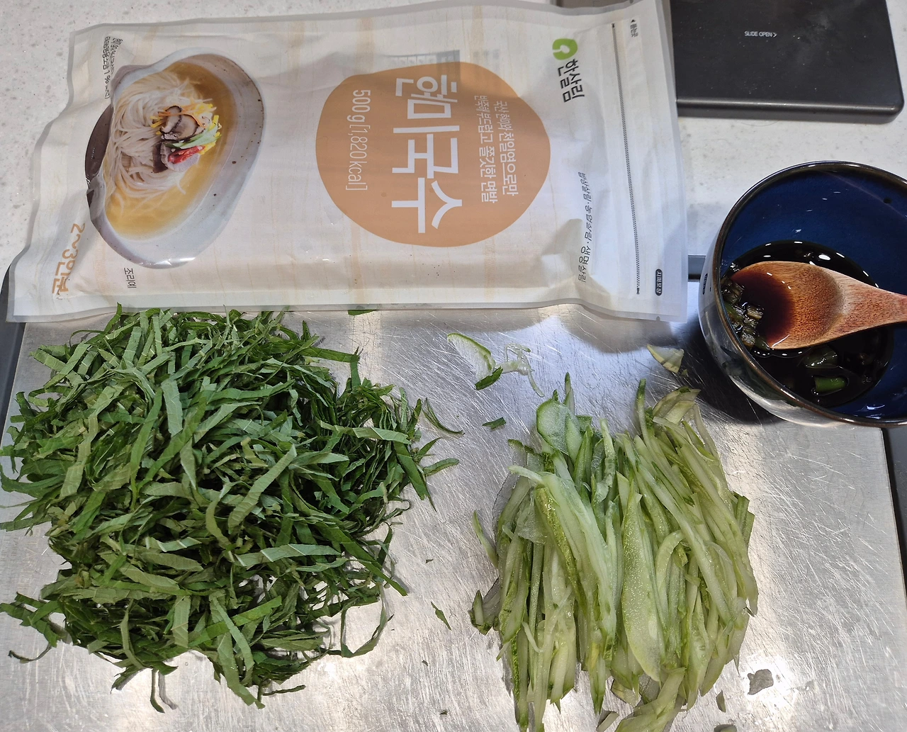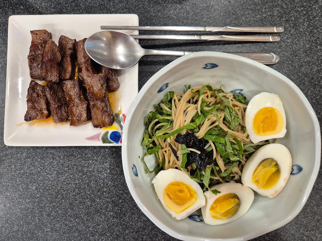 오늘 캠프 가기 전에 점심을 뭘 먹이나 하다가 내가 먹으려고 사둔 한살림 현미국수를 들기름 막국수 식으로 비벼먹기로 했다. 현미국수는 쫄깃하고 탱탱해서 소면과는 완전 느낌이 달랐지만 양념을 비비니 맛이 좋았다. 남아있던 깻잎과 오이를 가늘게 채쳐 넣고 간장4, 식초1, 알룰로스1/2, 들기름4, 청양고추1로 장을 만들어 비벼먹었다. 먹기 싫어할까봐 시즈닝 해서 얼려두었던 스테이크 고기도 잘라서 구워주었다. 달걀도 2개나.