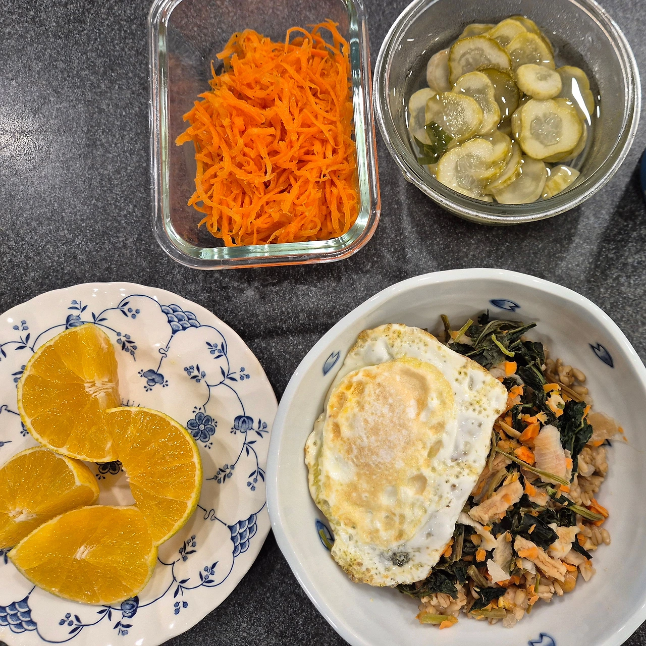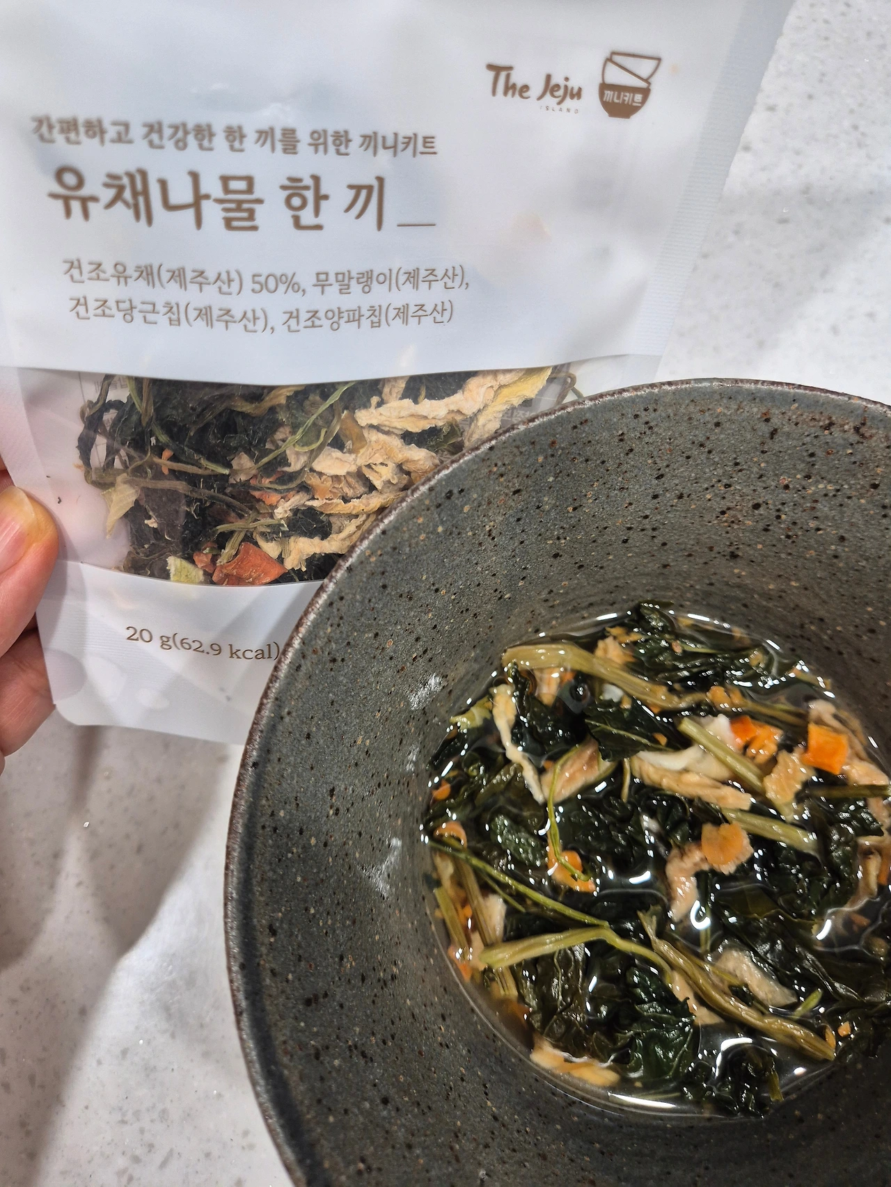 다양한 주방소품들이 딱 용도에 맞게 나오는 시대이긴 하지만, 이미 30대때 다 소용없고, 기본으로 다양하게 베리에이션하는 게 최선이라는 것을 깨달았기에, 주문을 취소하고 뜨거운 물을 나물 한봉지가 적셔질만큼 붓고 30분 정도 두었다가 밥위에 얹어 밥 해동 하듯 3분을 돌렸다. 그랬더니 역시 성공해서, 맛간장을 조금 뿌려 맛있게 먹었다. 만족도 높은 식사였다.