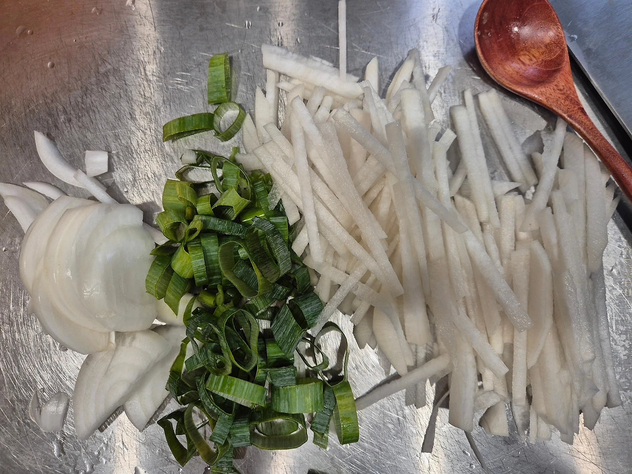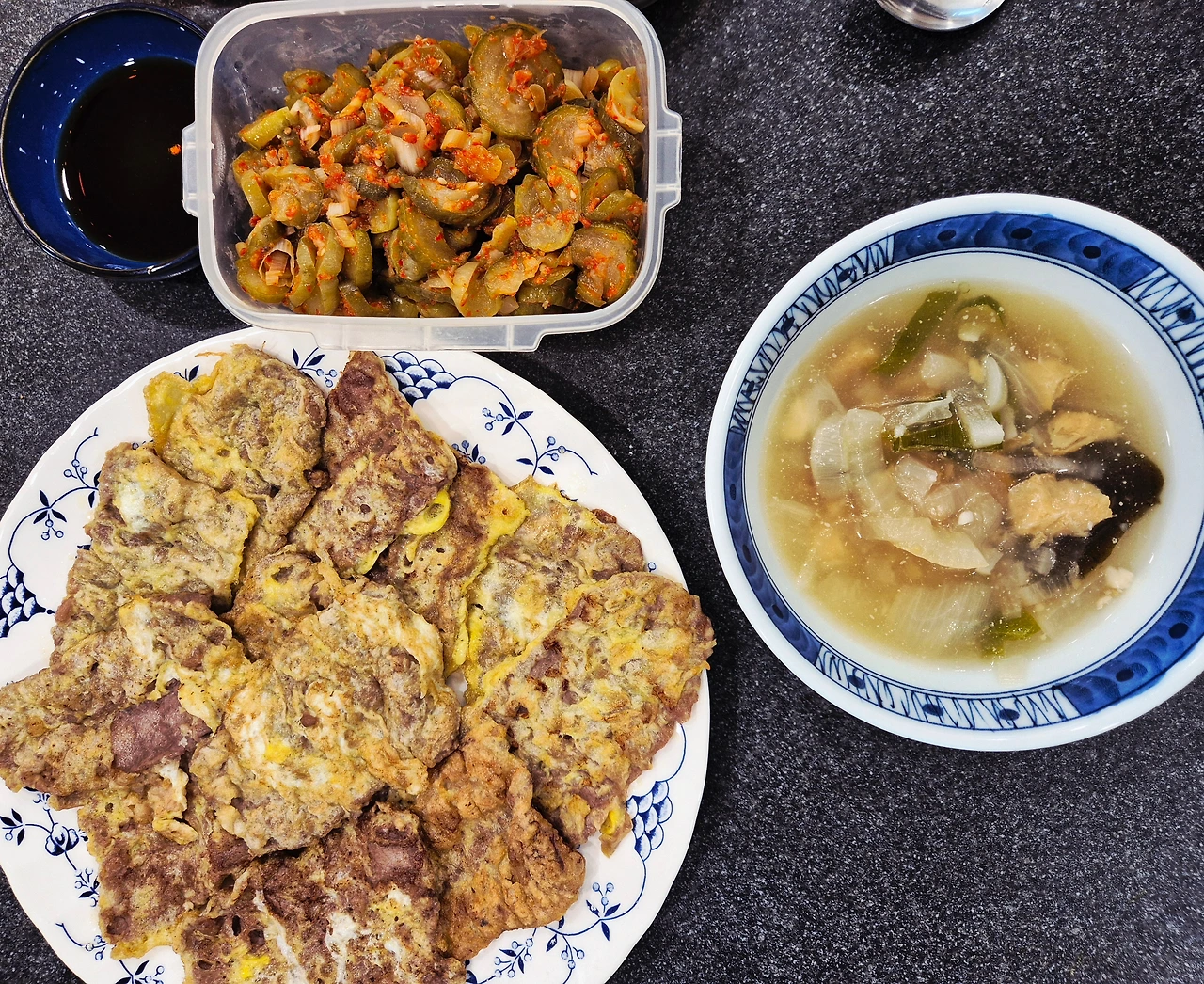 토요일 아점을 준비하려는데 딱히 뭐 떠오르는 게 없어서 냉동실을 열어보니 황태채가, 냉장실에는 벌써 2달쯤 전 도착한 무가 포장도 벗기지 않은 채 들어 있었다. 세상 쉬운 황태무국을 진짜 몇달만에 끓였다. 3쿼터에 들어서서야 역전을 노리는(아들이 스스로를 수식하는 구절) 둘째는 요즘 집에서 밥을 먹는 일이 없다. 아침마저 소화가 어렵다며 도시락도 안가져가고 있다. 그래서 마련한 주말특식이 고기전. 부침 중 가장 쉽지만, 우리 아들들은 제일 좋아하는 전이다. 한상 차려 뚝딱 먹이고 황금향 두개 잘라줘서 먹이고 또 공부하러 나갔다.