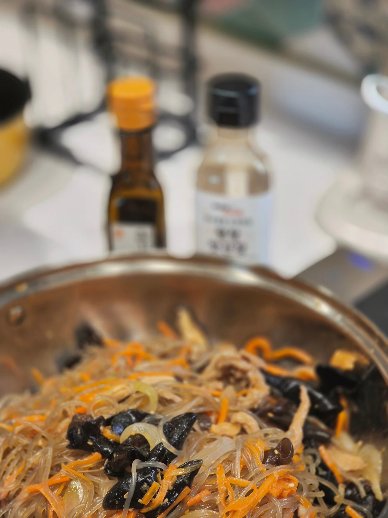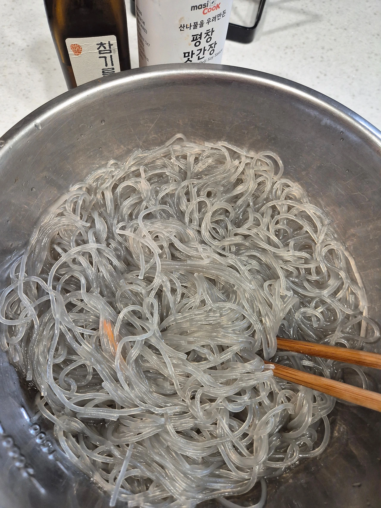 당면을 먼저 보울에 담고 진간장과 약간의 설탕으로 미리 간했다. 오늘 너무 설탕을 많이 쓰지만. 당면이 불면서 싱거워지기 때문에 간을 좀 세게 해도 나중엔 괜찮아진다. 여기에 야채를 때려 넣고 비비다가 참기름과 깨를 뿌리고 간을 맞추고, 볶은 돼지고기를 넣어 또 섞는다. 야채가 다양하게 더 많았으면 좋았으련만. 그래도 이쯤에서 만족.