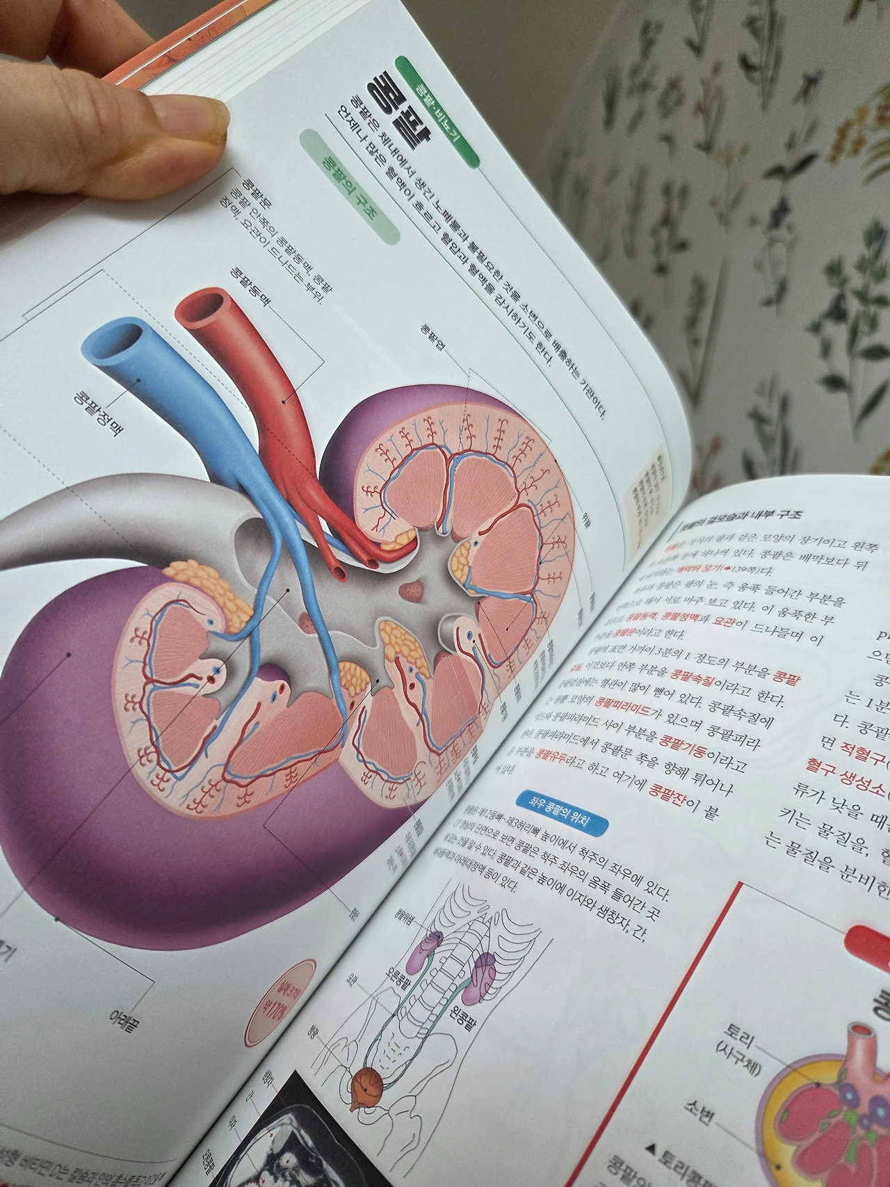 수술을 받고 요양병원에서 지내면서, 또 너무 신기하고 궁금했다. 피부를 절개한 곳은 어떤 원리로 다시 복원이 되는 걸까? 신장의 1/3을 절제했다는데, 신장은 원래 뭘 하는 곳이고, 그 원리는 뭐지? 신장을 절제하면 그 부분의 기능은 어떻게 되는걸까? 어떻게 그렇게 심했던 통증이 날이 갈수록 눈에 띄게 줄어드는 걸까? 병원에서 처방한 약은 어떻게 의사샘이 말씀하신 대로 정확하게 48시간만에 효과를 낼까? ... 나의 무지함의 크기만큼 궁금한 것들도 많아졌다. 다행히 나같은 사람을 위해 만들어진 일본 책들이 번역되어 있었다. 냉큼 한권 주문했다. <인체 구조 교과서 - 내 몸에 생긴 질병을 해부학적으로 알고 싶을 때 찾아보는 인체 의학 도감>