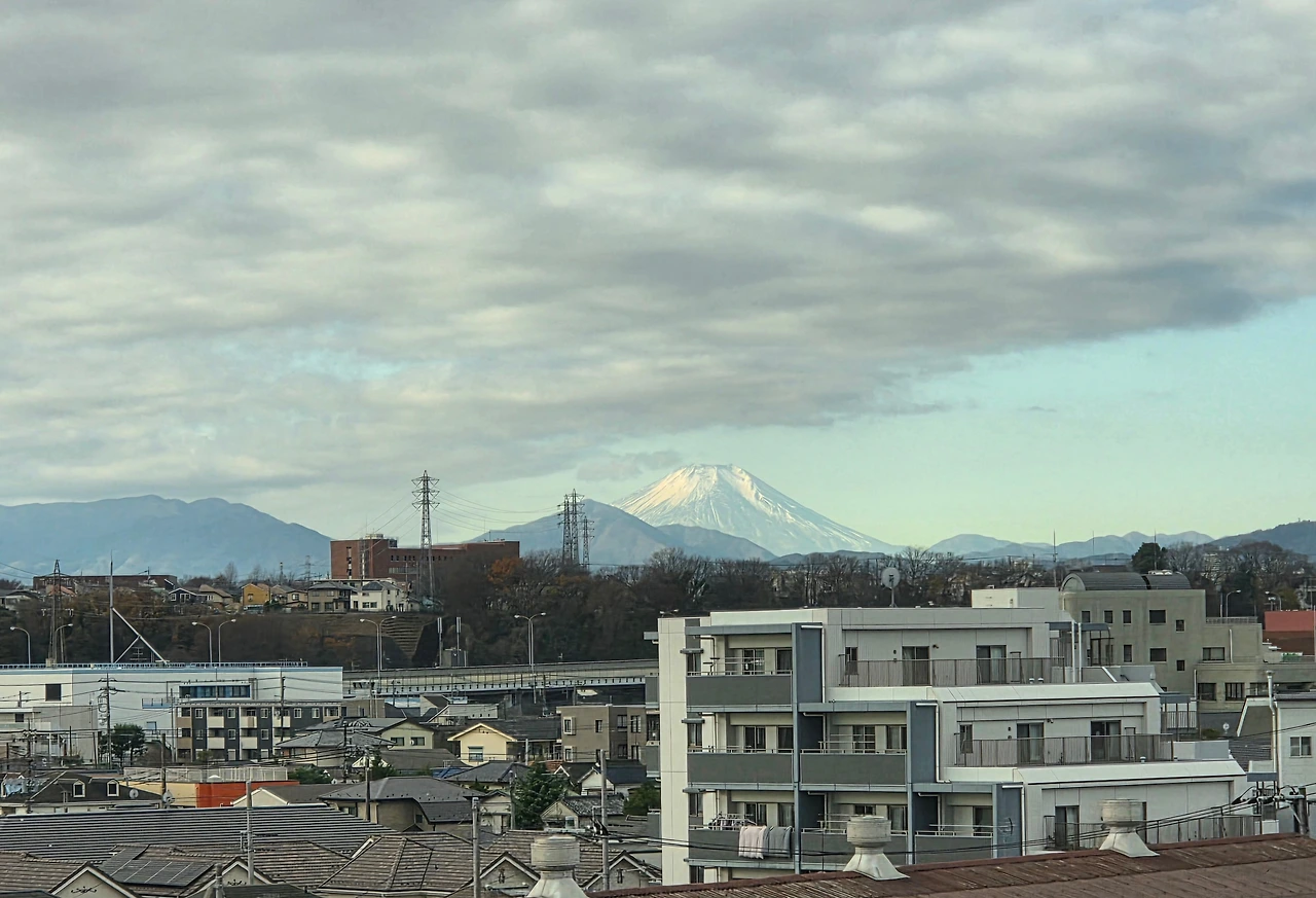 서울에는 눈예보가 있다더니, 도쿄도 기온이 급강하해서, 도쿄 특유의 '뼛속에 스미는' 찬 날씨였다. 모노레일 창밖 마을 배경으로 멀리 후지산이 보였다.