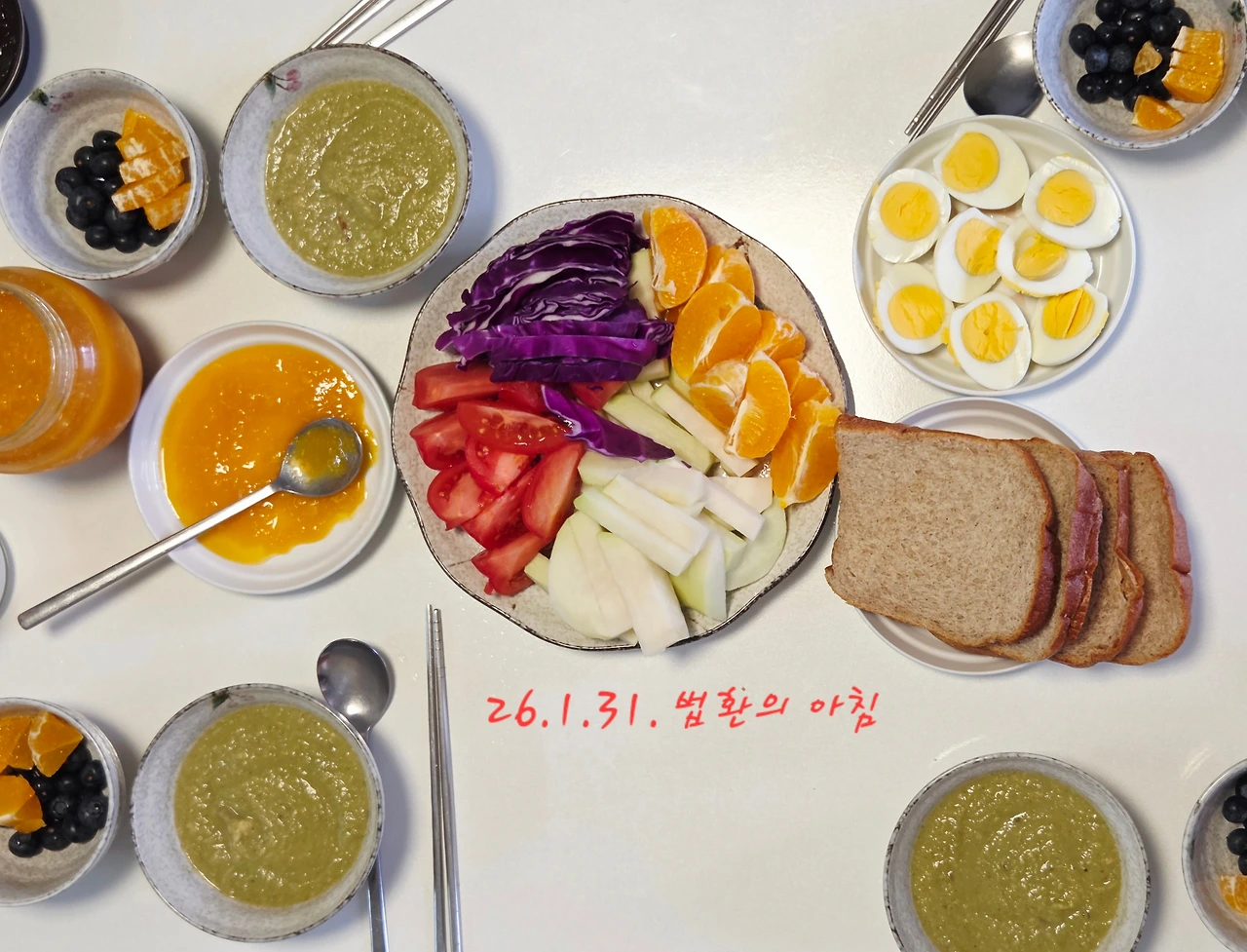 이번 법환 환우회는 일명 힐링캠프. 잘 먹고, 잘 자고, 운동하고, 수다떠는 시간을 실컷하는 것을 암묵적으로 합의하고 온 여행이었다. 나는 아침식사 담당을 자처해서 마치 흑백요리사 대결에 나가는 쉐프처럼 소금, 후추, 들기름 한병, 간단한 식재료에 그 무거운 핸드블렌더까지 챙겨오느라 짐이 15킬로나 되었다. 암환자가 된 후 맛있게 먹고 있는 음식들을 누군가와 나누어 함께 먹을 수 있는 흔치 않은 기회였다. 게다가 대장에 병을 얻어 고생하고 있는 정언니에게 간단하면서도 맛있는 음식을 먹이고 싶었다.