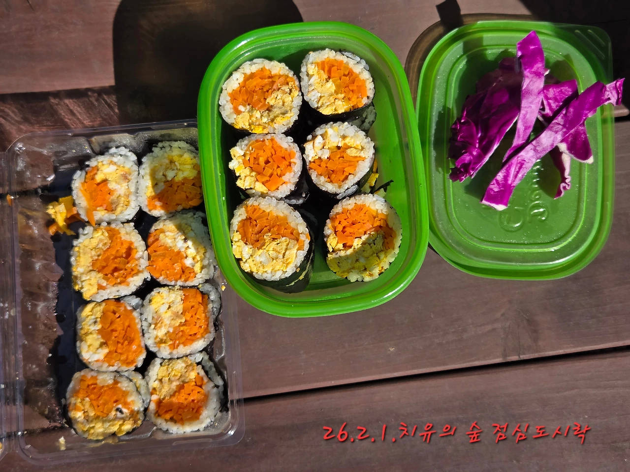 치유의 숲과 근처에서는 음식을 먹지 못하게 되어 있음을 알면서도 싸들고간 도시락을 찻집 옆 식사 공간에서 아주 맛나게 먹었다. 역시 김밥은 야외에서 먹어야 제맛이다.