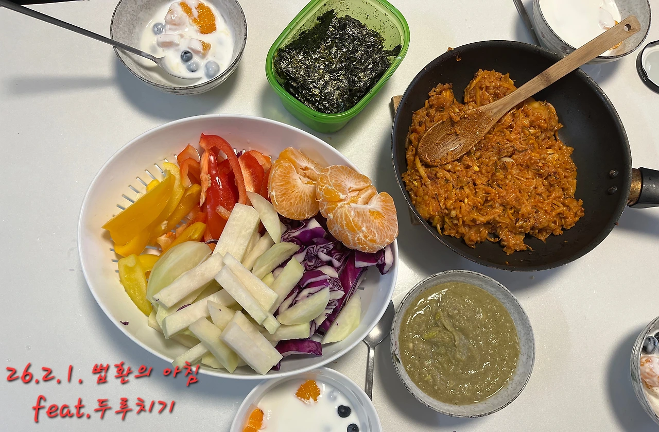 김이 사랑하는 치유의 숲에 가기로 한 날이다. 아침은 둘쨋날 용이네식당에서 다 먹지 못하고 가져온 두루치기 볶음밥을 다시 데워서 김에 싸먹었다. 수프는 양파와 양배추, 병아리콩, 브로콜리를 갈아 만들었다.