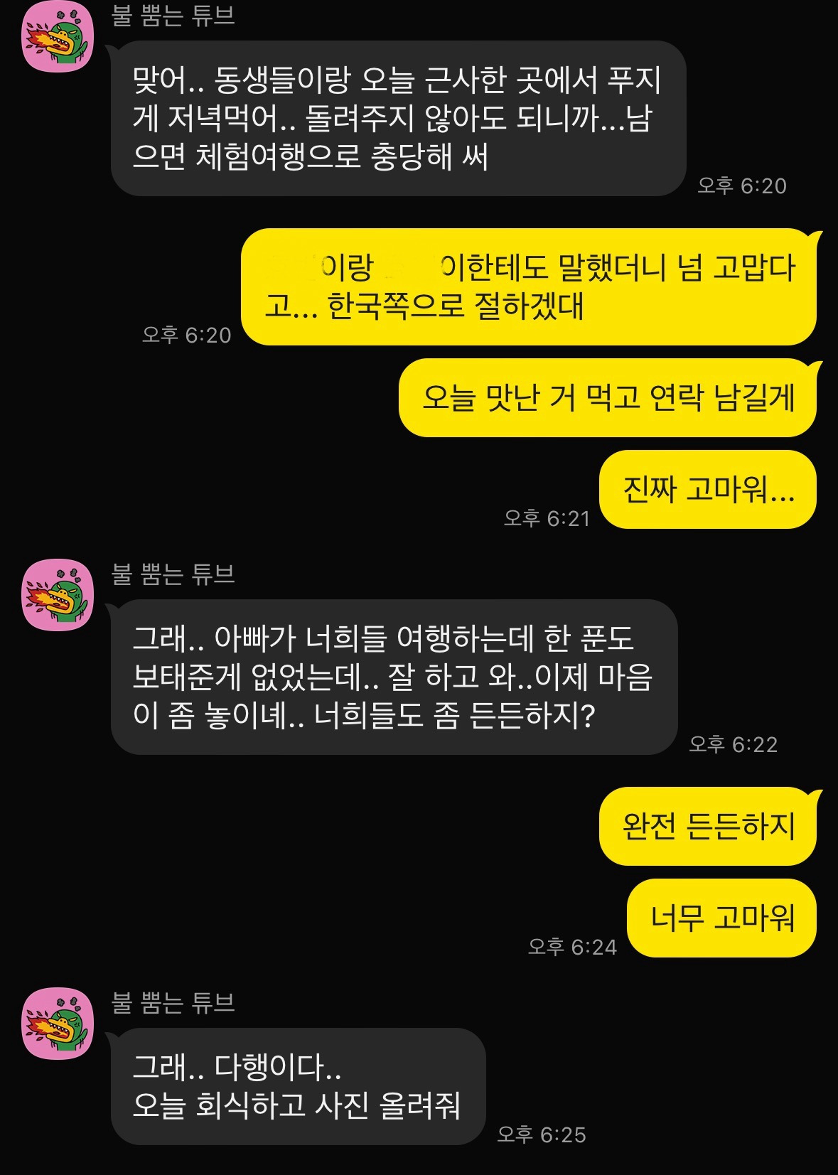 그때 마침 아빠 ‘고니’의 연락이 왔다. 돈 없어서 힘든 여행을 하고 있을 텐데 좋은 식당에 가서 맛있는 음식