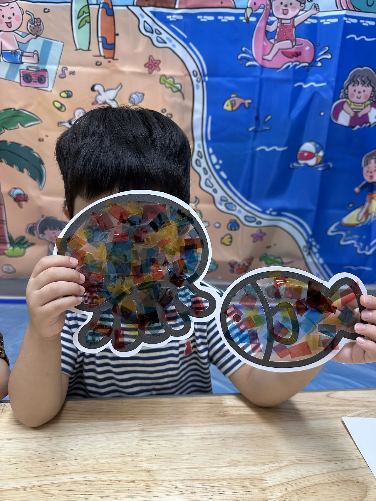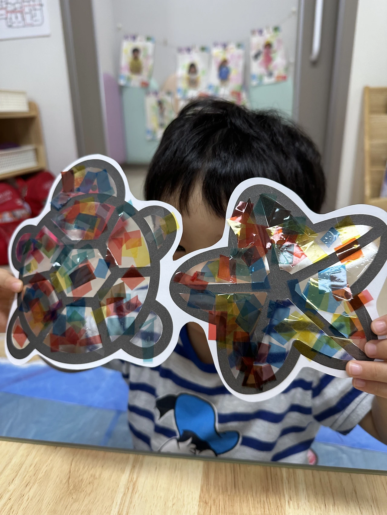 투명한 플라스틱 동그라미에 셀로판지와 물감을 섞어 바르면 햇빛을 만나 반짝거리는 작은 썬캐쳐가 된다.