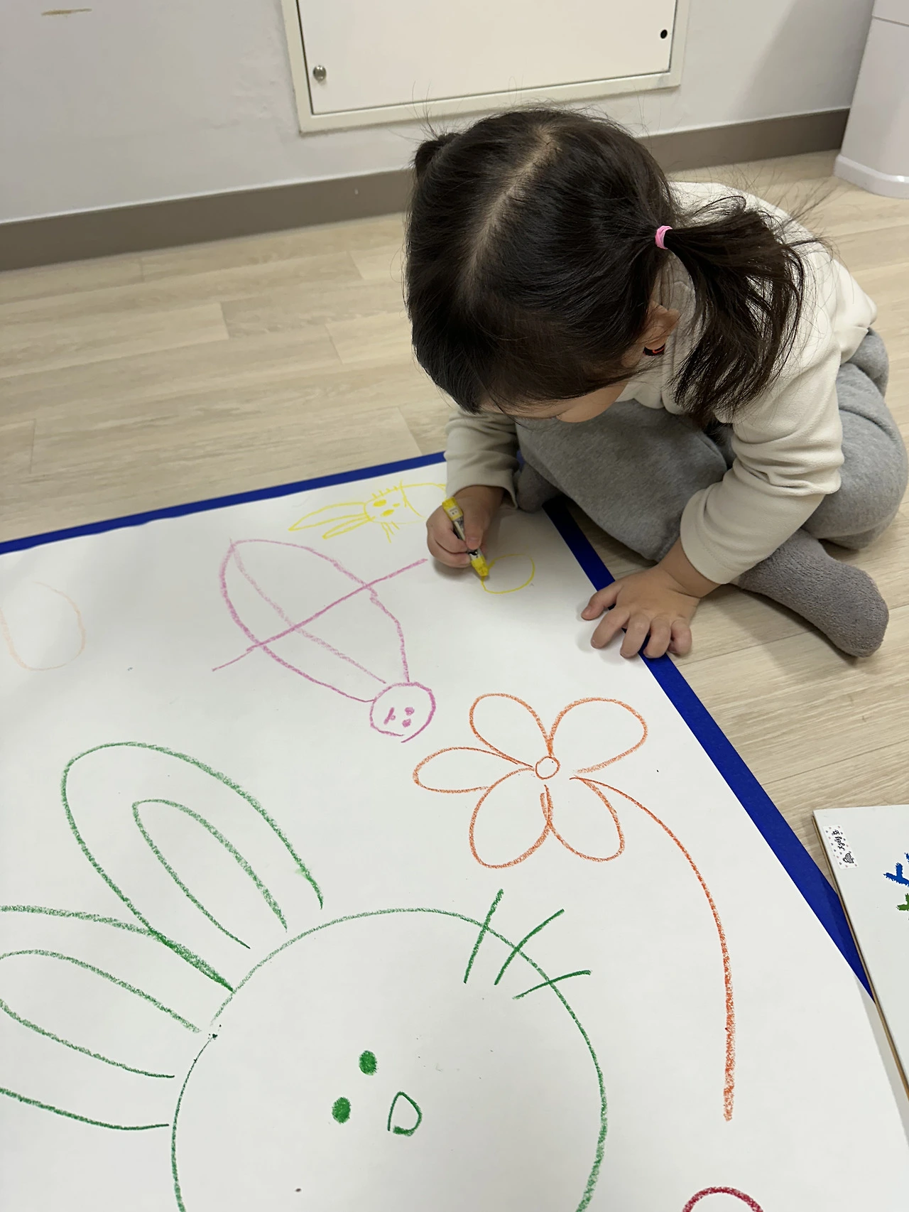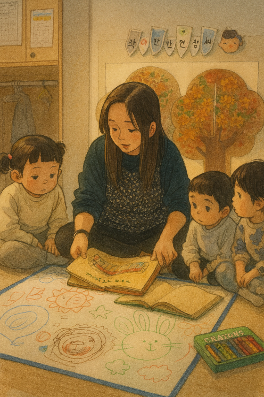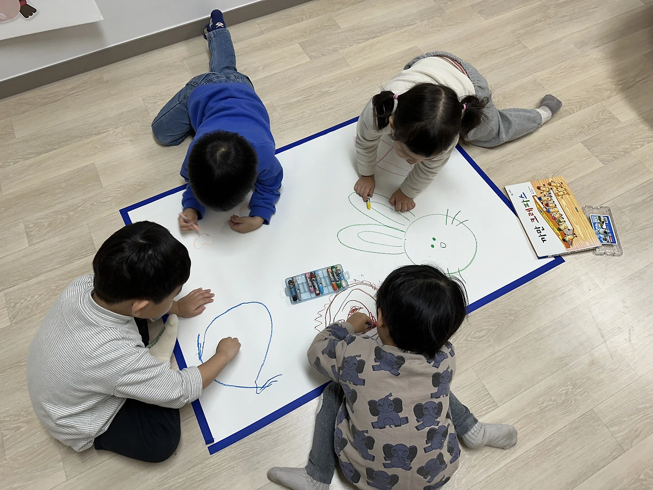 누가 먼저랄 것도 없이, 마치 도화지가 아이들을 부른 것처럼 작은 손들이 슬며시 크레파스를 집어 들었다.