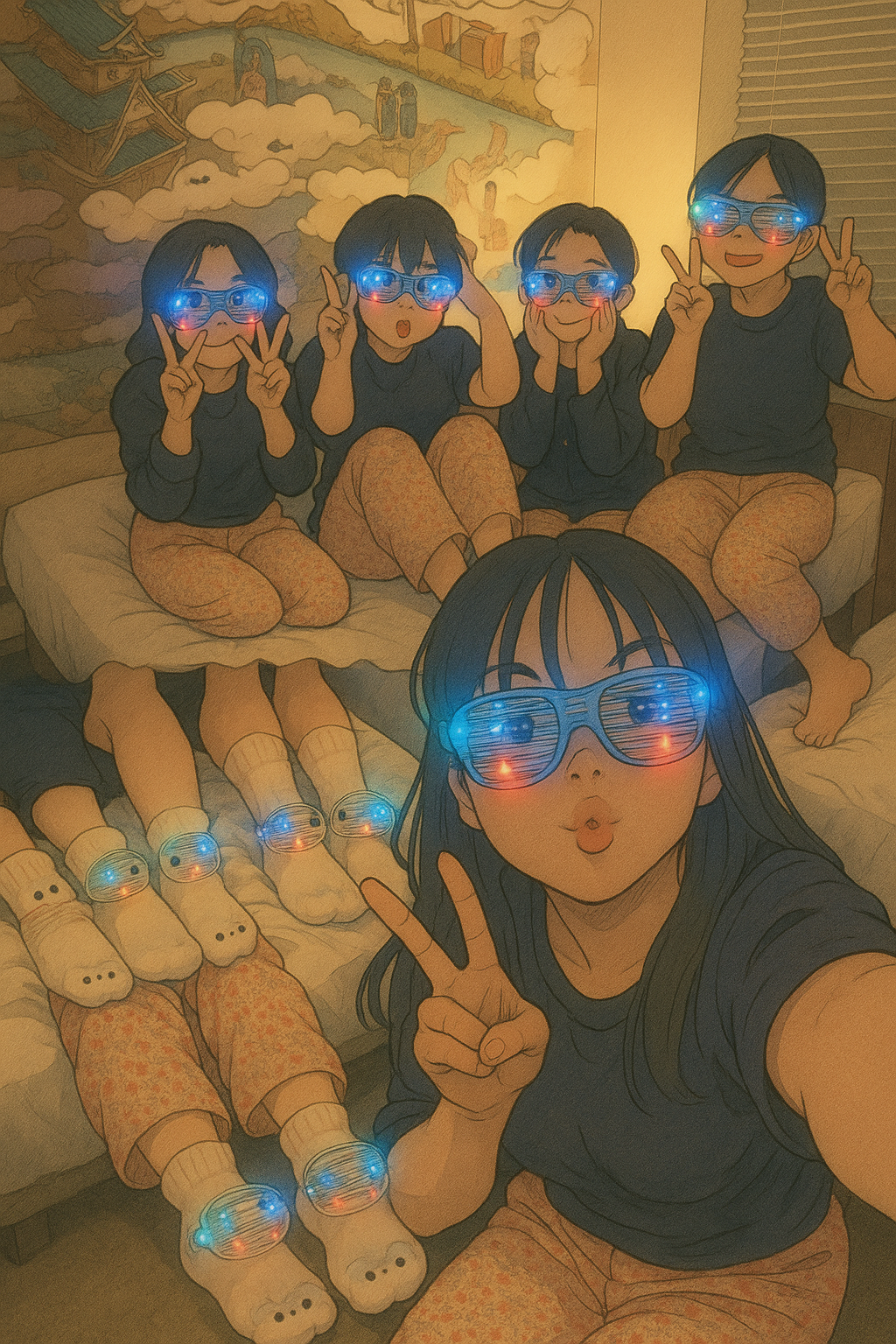 룸 안이 갑자기 클럽처럼 번쩍이기 시작했고, 다섯 명 모두 정신없이 웃으며 사진을 찍었다.
