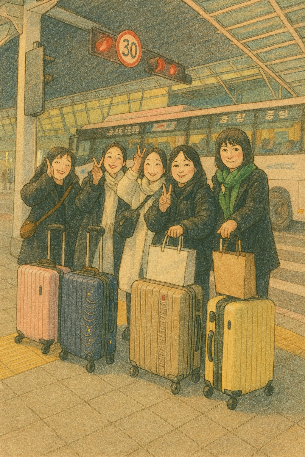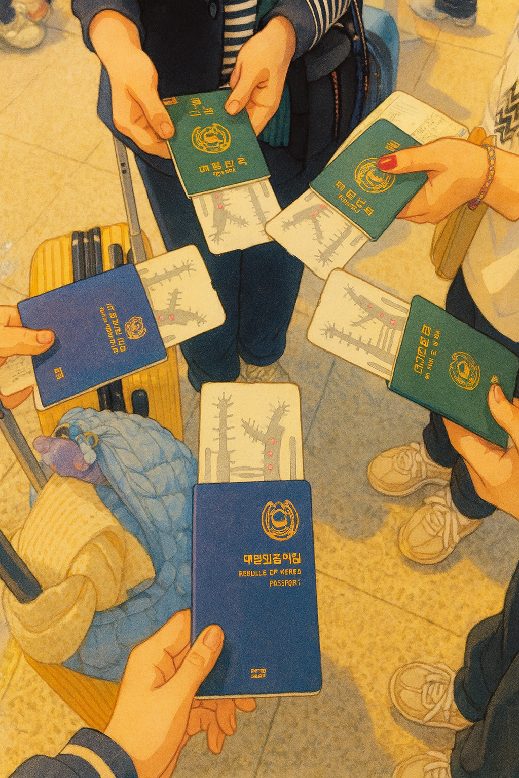 다섯 명이서 캐리어를 가지런히 세우고, 피곤과 설렘이 뒤섞인 얼굴로 브이 포즈를 취했다. 그리고 손에 쥔 여권을 한데 모아 사진을 또 한 장.