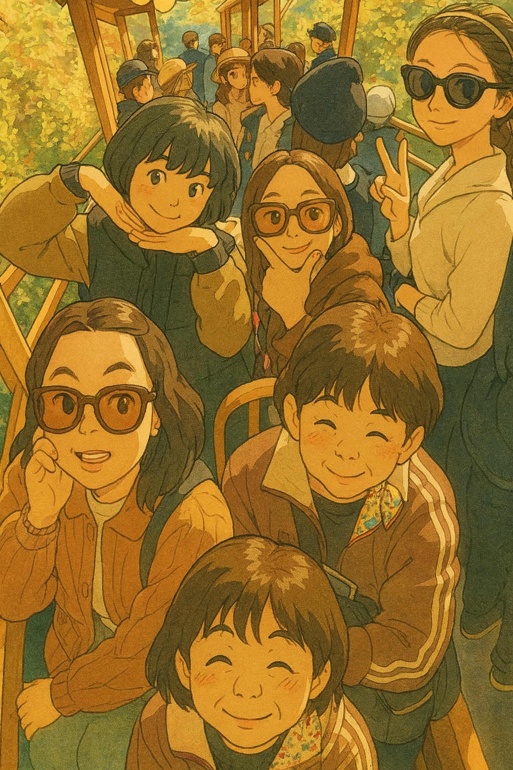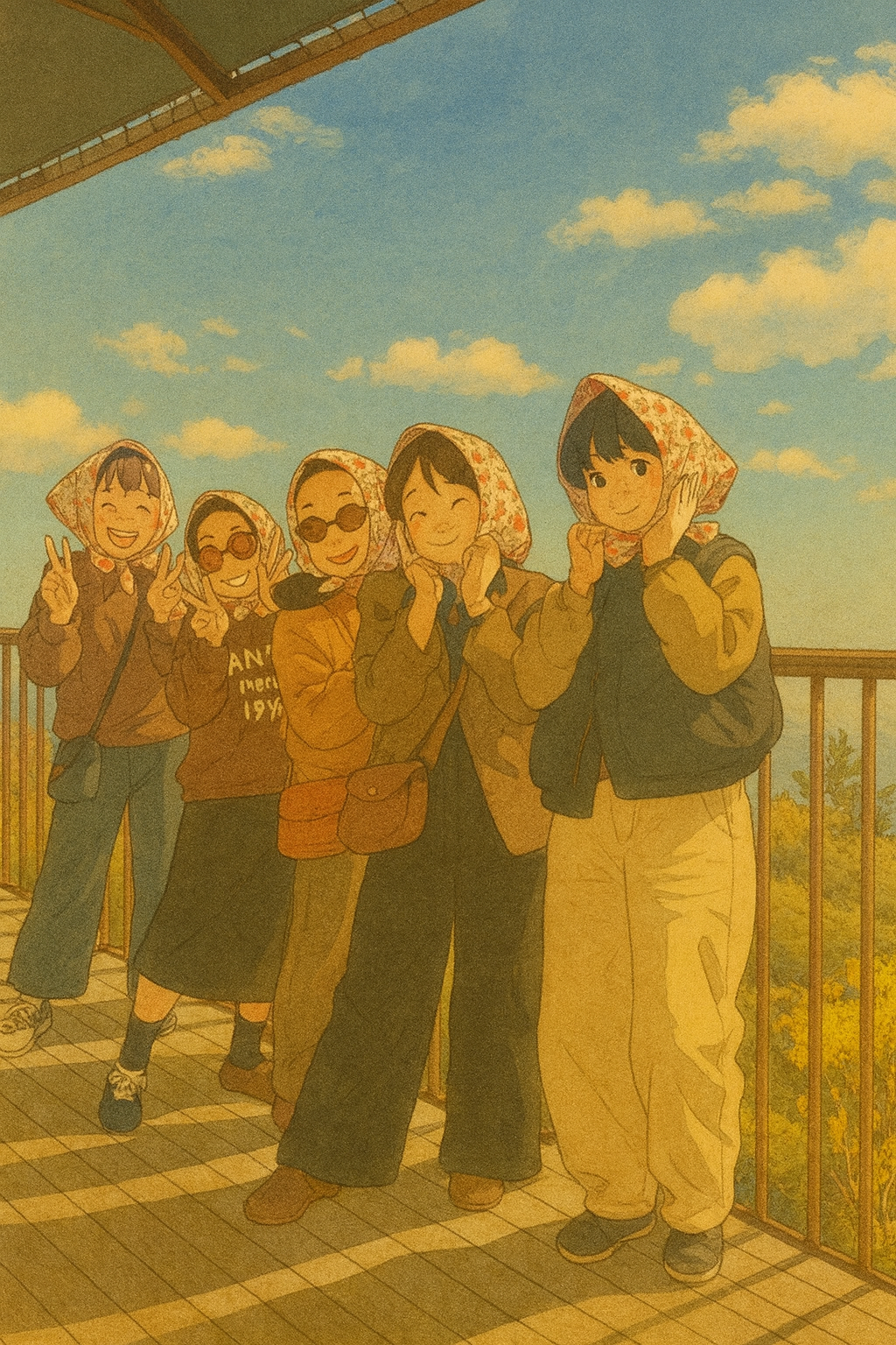 브라운 계열의 옷을 맞춰 입은 우리 다섯은, 마치 작은 팀이 된 듯 단단한 결속감을 느끼며 아침부터 발걸음을 맞춰 고베로 향했다. 롯코산 케이블카 앞에서 셀카봉을 꺼내 들자마자, 여행 셀카 장인의 본능이 폭발했다. 케이블카에 비친 우리의 얼굴은 이미 반쯤 웃음이 터져 있었고, 흔들리는 차창 밖으로는 고베의 속살이 조용히 깔리고 있었다.