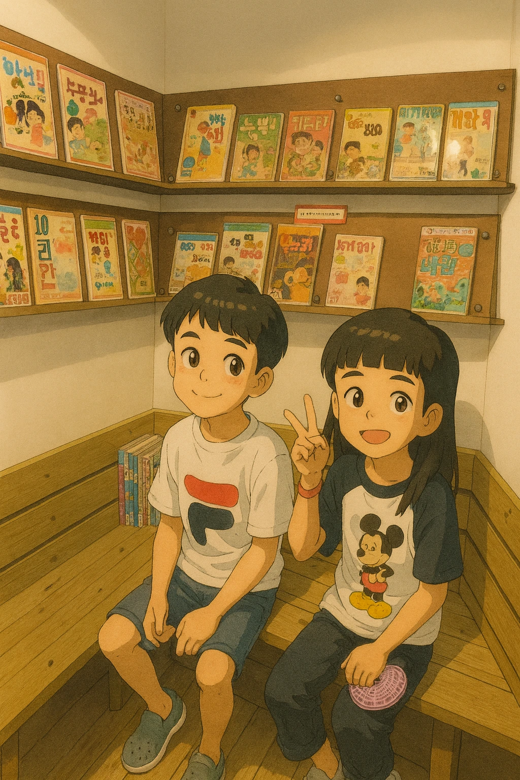 책장이 가득한 만화책 방에서 아이들은 나란히 앉아 책장을 넘긴다.