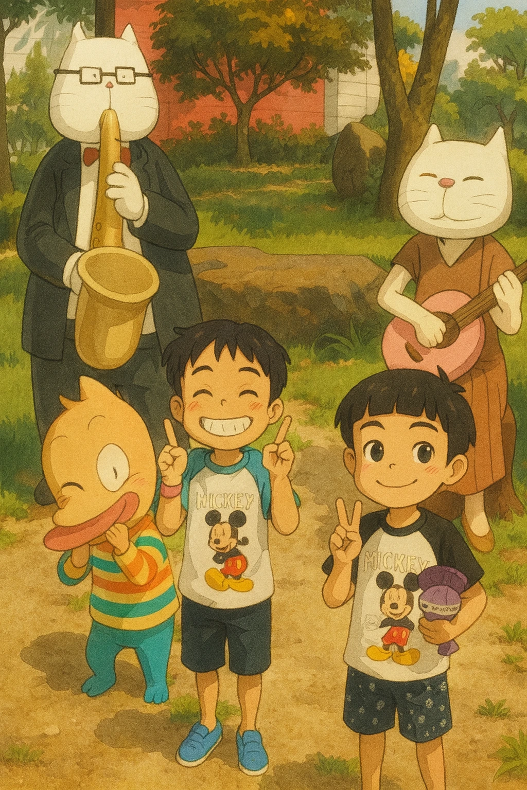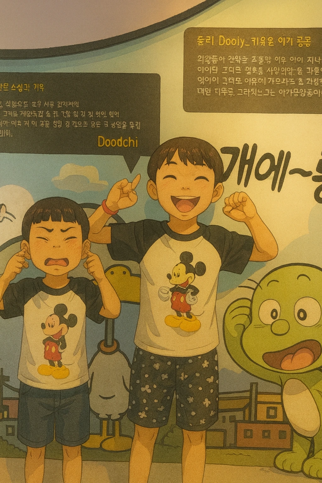 아기 공룡 둘리, 장난꾸러기 또치, 그리고 그 옆에서 익살스러운 표정을 짓는 아이들의 모습이 겹친다.