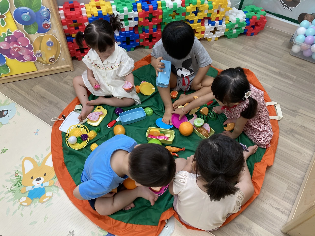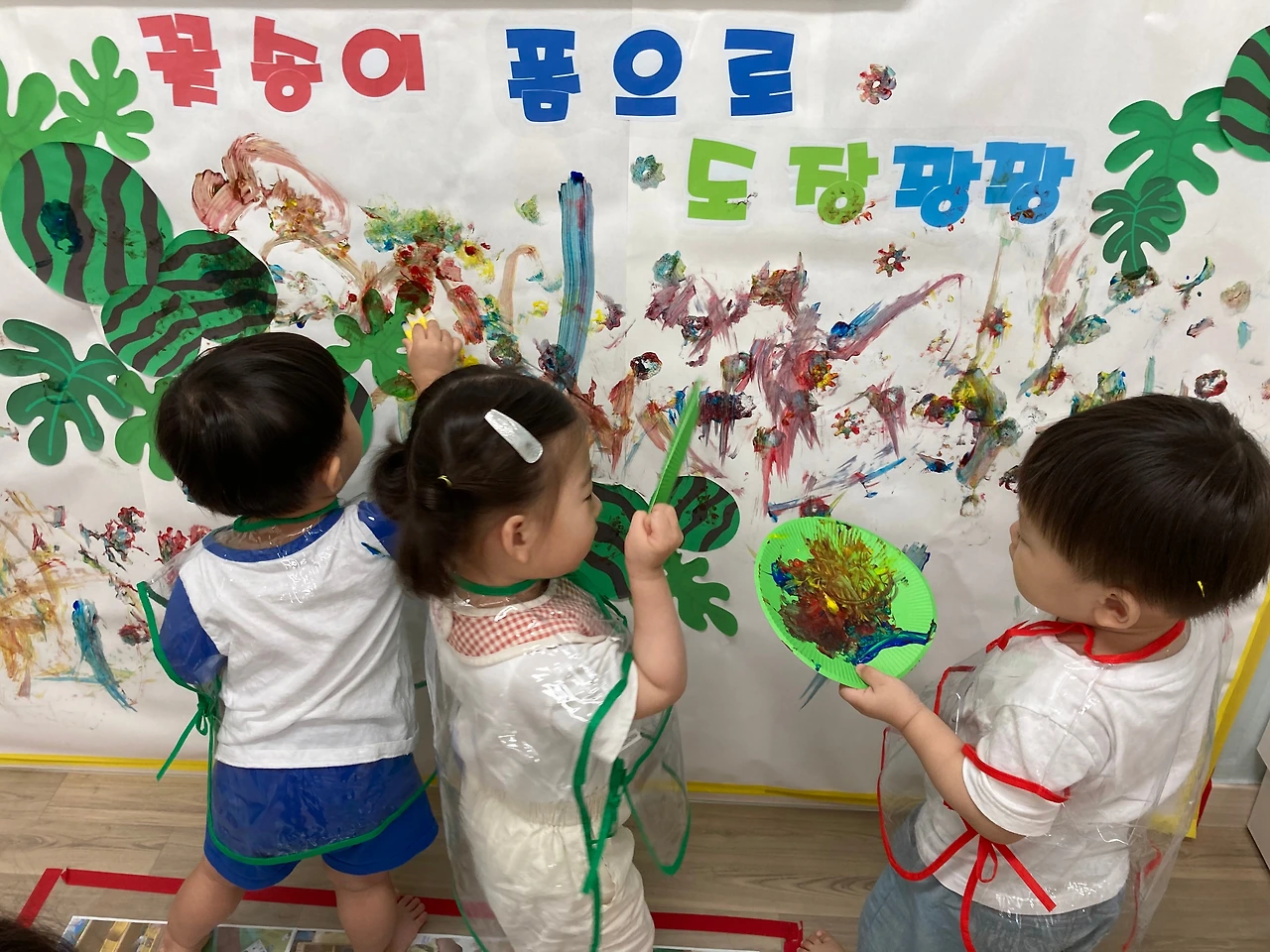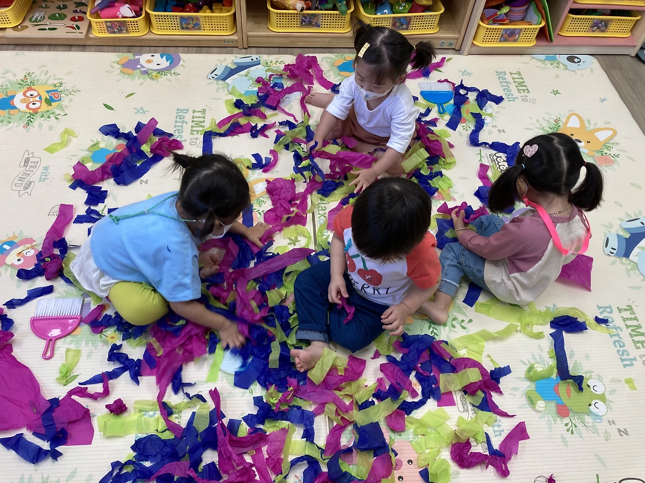 바닥은 또 다른 풍경이었다. 몇몇 아이들은 무릎을 꿇고 엎드려 종이 위에 그림을 그렸고, 옆에서는 종이 조각을 한 움큼 쥐어 머리 위로 흩날리며 눈 오는 듯 장난을 쳤다. 부스러진 조각들이 바닥에 수북이 쌓였지만, 그 속을 구르며 까르르 웃는 아이들의 모습은 작은 축제 같았다. 어떤 아이는 블록을 바닥에 길게 이어 붙여 기찻길을 만들었고, 그 옆에서 친구들은 그 길을 따라 기어 다니며 마치 여행이라도 떠나는 듯 즐거워했다.