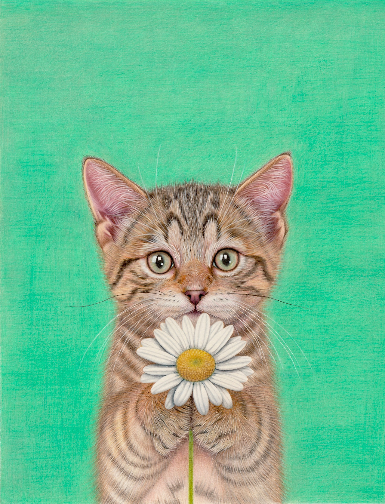 또 한편으로는 어린 고양이는 그 시절 나이다. 꽃은 나의 아빠이다. 꽃을 들고 있지만 역설적으로 잃은 것이다. 고양이의 표정이 슬퍼 보이는 것은 이 때문이다.