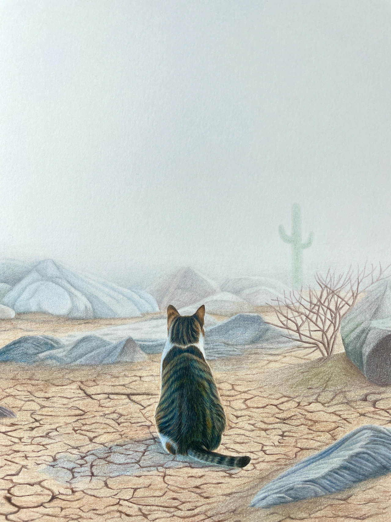 이 그림은 나의 우울을 표현한 그림이다. 마음이 힘들 때면 고양이 얼굴을 그릴 수가 없었다. 고양이 얼굴을 그리게 되면 고양이의 얼굴에서 나의 모습이 나타나게 되는데, 고양이의 얼굴이 그토록 위태로워 보일 수가 없었다. 그래서 나는 마음이 가라앉을 때 이 고양이의 뒷모습을 그리게 되었다. 안개가 껴서 사방이 보이지 않는 곳에 뒤돌아 앉아있는 고양이의 모습은 마치 내 모습과 같다. 하지만 고양이에게 드리워진 그림자가 곧 시간이 지나 해가 위로 솟으면 안개가 걷힐 것이라는 것을 암시한다. 나도 그렇게 되기를 바라는 마음으로 누군가에게도 그러기를 바라는 마음으로 그림을 그린 것이다.