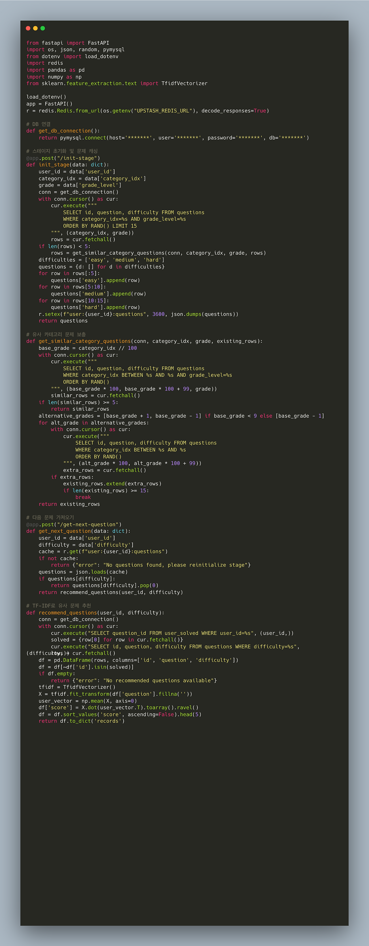 특히 AI 엔진에서는 TF-IDF 기반의 문제 추천 로직을 구현했습니다. 사용자에게 이미 풀었던 문제를 제외하고, 과거 틀렸던 문제나 다른 사용자들이 많이 틀린 문제 등을 다양한 라벨로 분류하여 추천하는 전략을 도입했습니다.