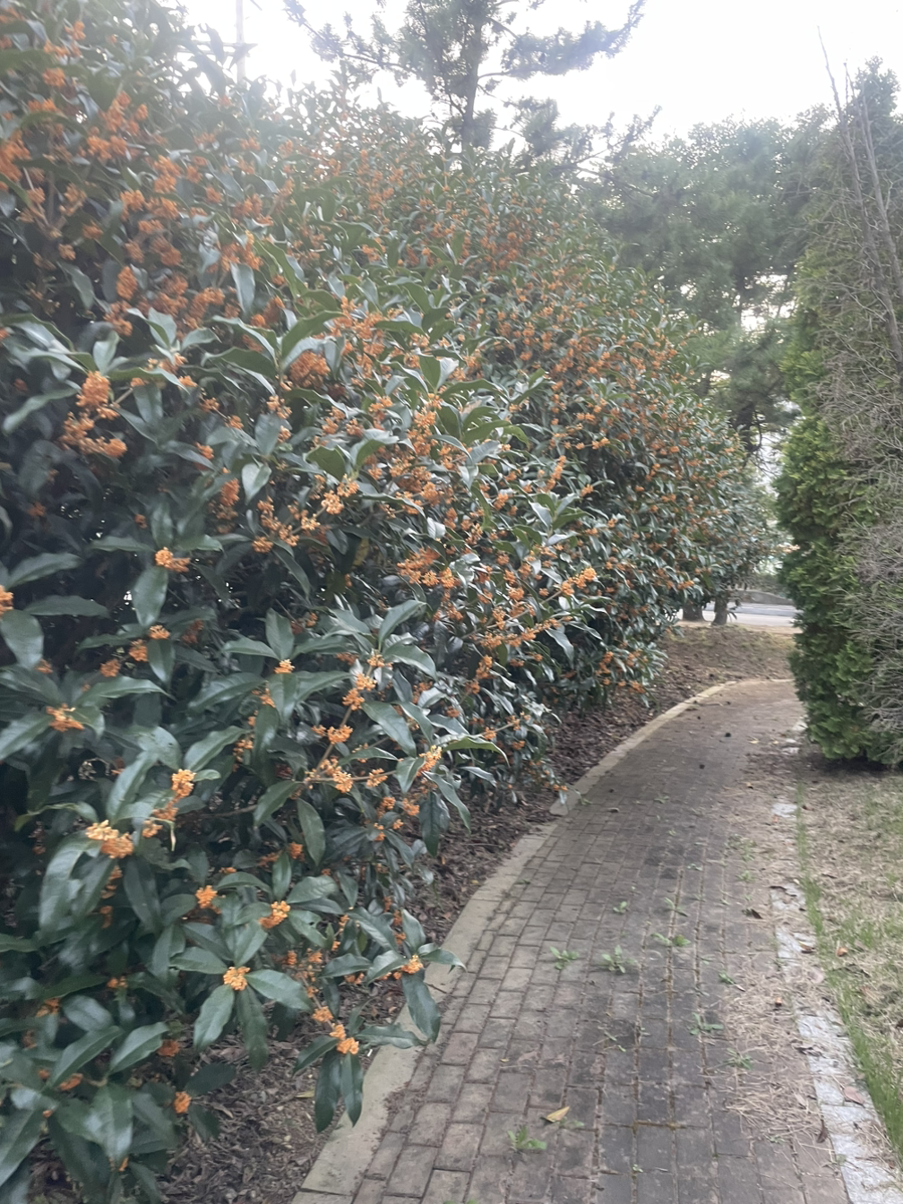 학교 바로 옆에 있는 작은 공원에도 금목서 나무가 꽤 많이 있고 본관 건물 앞 화단에는 장승처럼 계단 양쪽에서 두 그루가 예쁘게 자리하고 있다. 사계절 중 가을에 유독 계단이 덜 힘들게 느껴지는 이유가 금목서 향기 때문이라고 혼자서 주장하고 있다. 학교뿐만 아니라 동네를 걷다가 어디선가 달콤한 냄새가 난다 싶으면 어김없이 금목서가 있다. 가을을 좋아하는 이유는 사람마다 다양하겠지만 나는 금목서 향기 때문에 가을을 좋아한다.