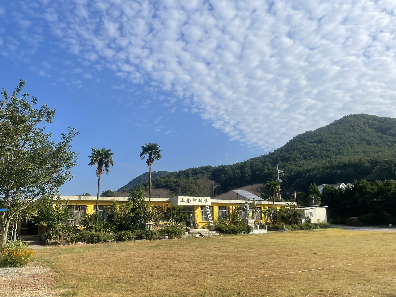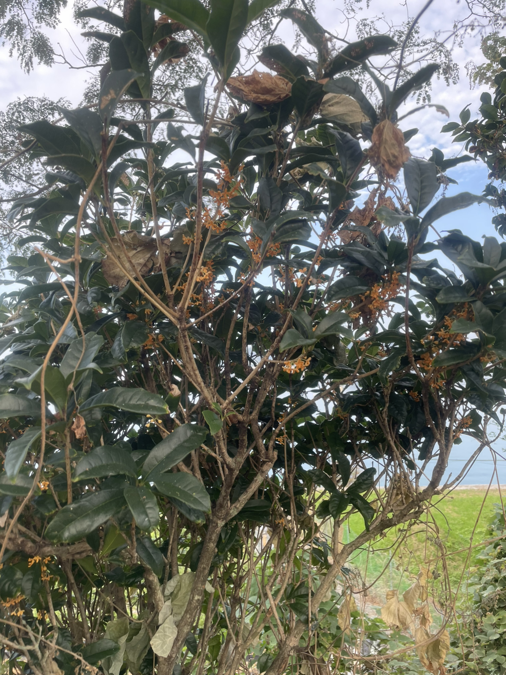 오래된 폐교를 고쳐서 만든 캠핑장이라 곳곳에 동상도 많고 고목들 사이에 잡초도 많아 어디서 나는 향기인지 분간이 안 갔다. 더 어둡기 전에 짐 정리를 서둘러하고 그날 밤은 떠 매가도 모르게 잤는데 아침에 아이들 소리에 일어나니 또 꽃향기가 나길래 텐트 주변을 찾아보니 어김없이 금목서다. 주변에 잡목들이 가득해서 무슨 나무인지도 몰랐는데 마르고 작은 금목서 한그루가 여전히 살아있어 향기를 퍼뜨리고 있었다.