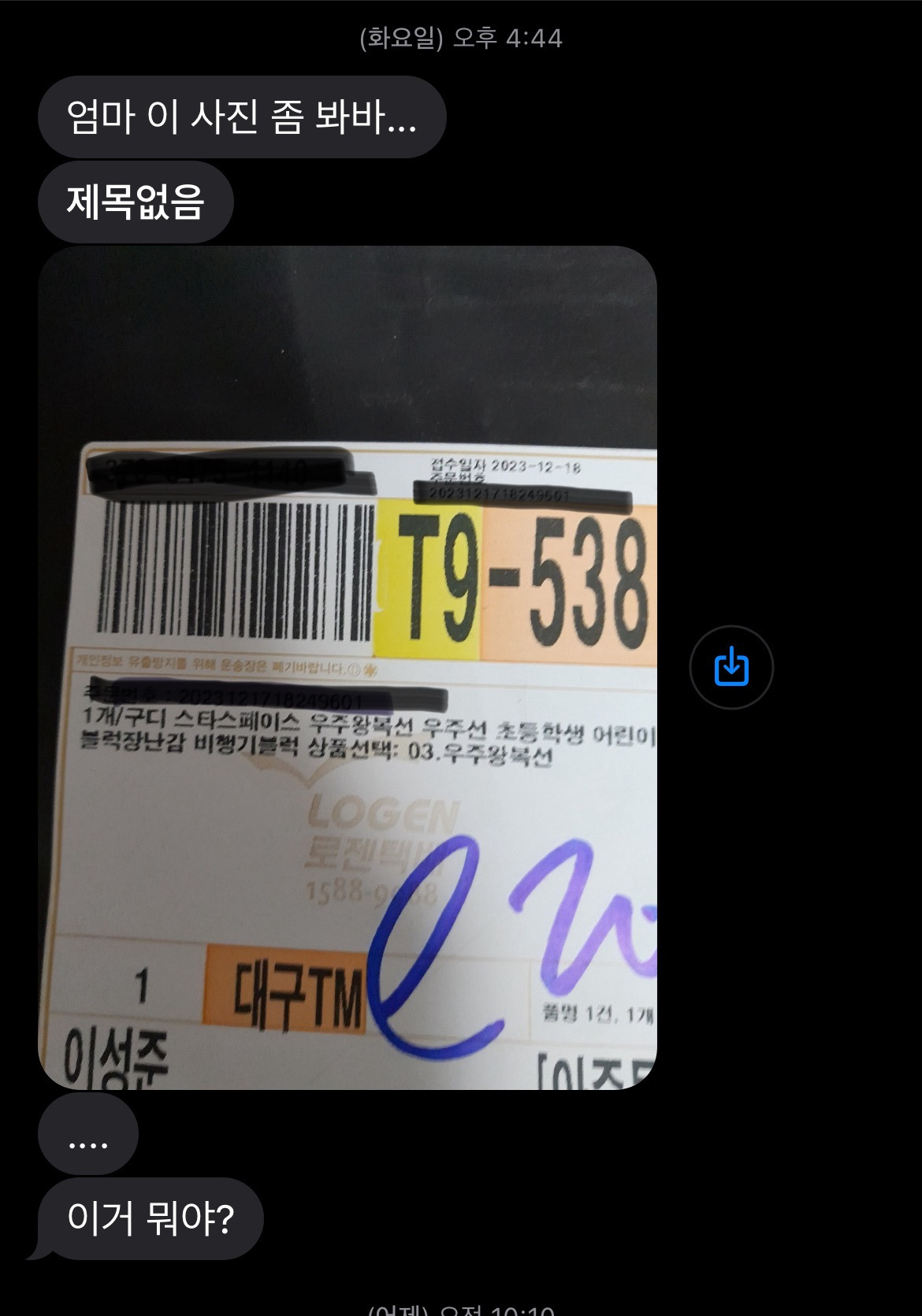 딸이 택배 상자 송장까지 읽어볼 줄은 몰랐다. 동생 줄 선물이라는 것을 눈치챈 딸은 자기 것은 없냐며 눈물을 글썽이길래 동생은 혹시 산타할아버지한테 선물 못 받으면 실망할까 봐 주문한 것이라고 이야기했다.