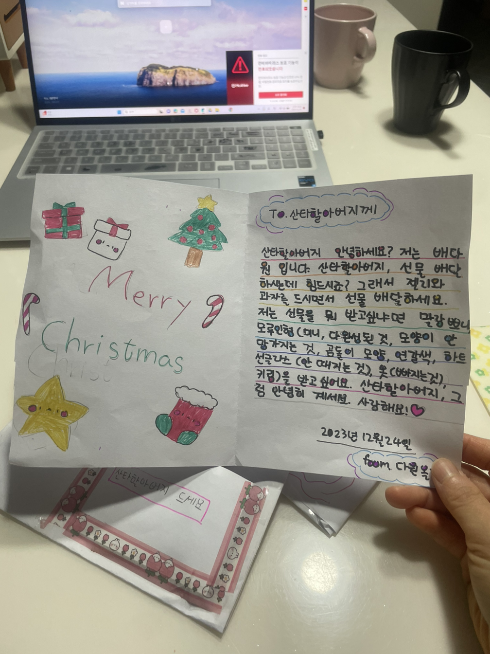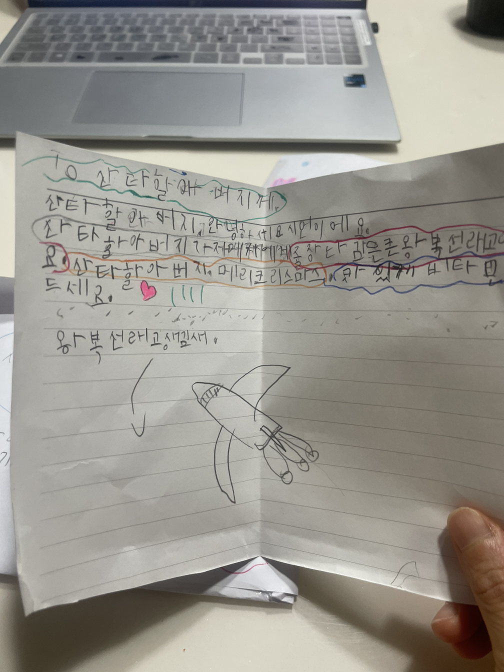12월이 되자 아이들에게 산타 할아버지에게 받고 싶은 선물을 물어봤다. 딸은 비밀이라면서 산타 할아버지만 볼 수 있게 편지로 쓴다고 했다.
