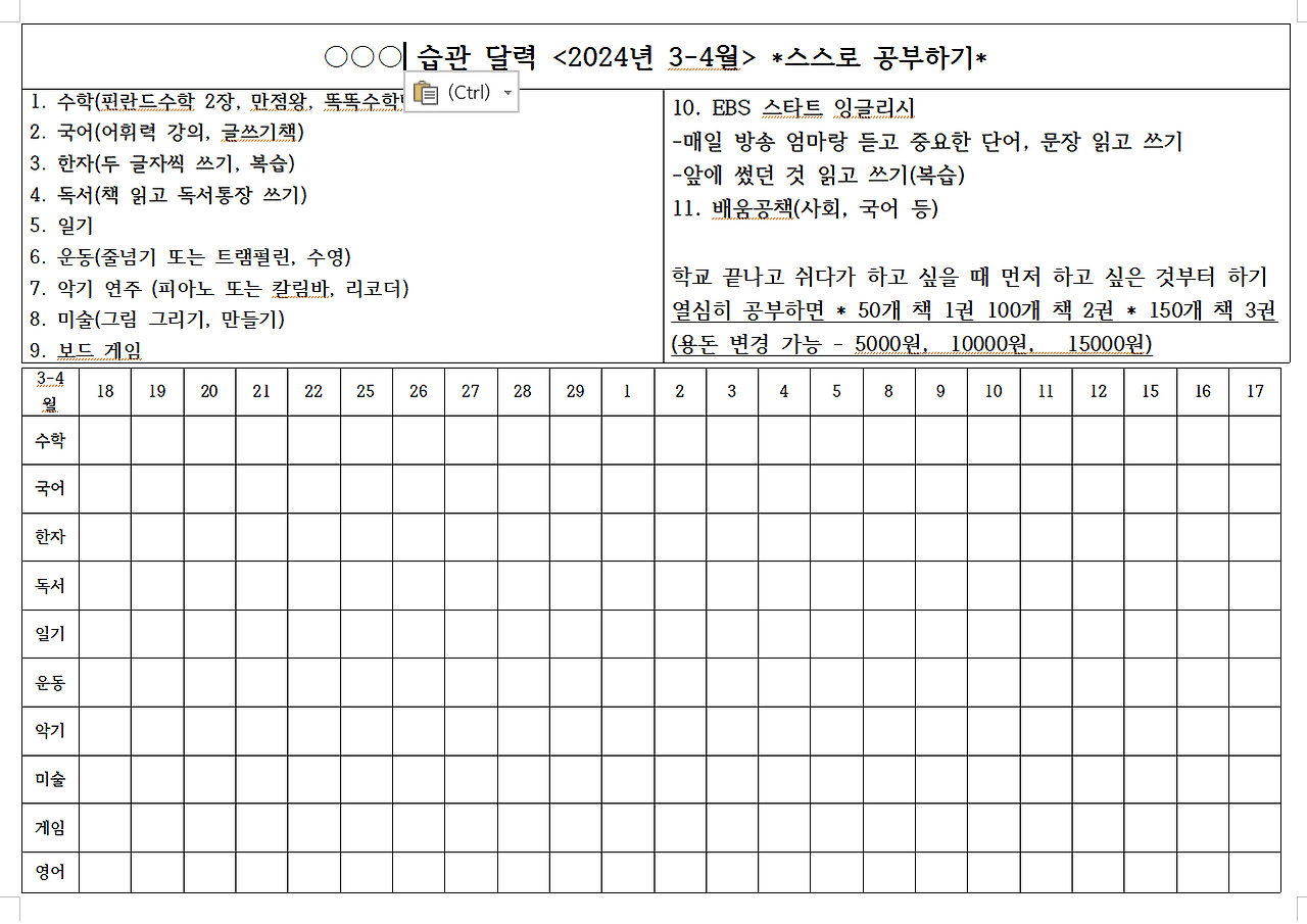 한자는 내가 적어준 한자어 1-2개를 10번씩 쓰는 것이고 운동은 방과 후에서 하는 줄넘기 또는 트램펄린을 할 때 체크한다.