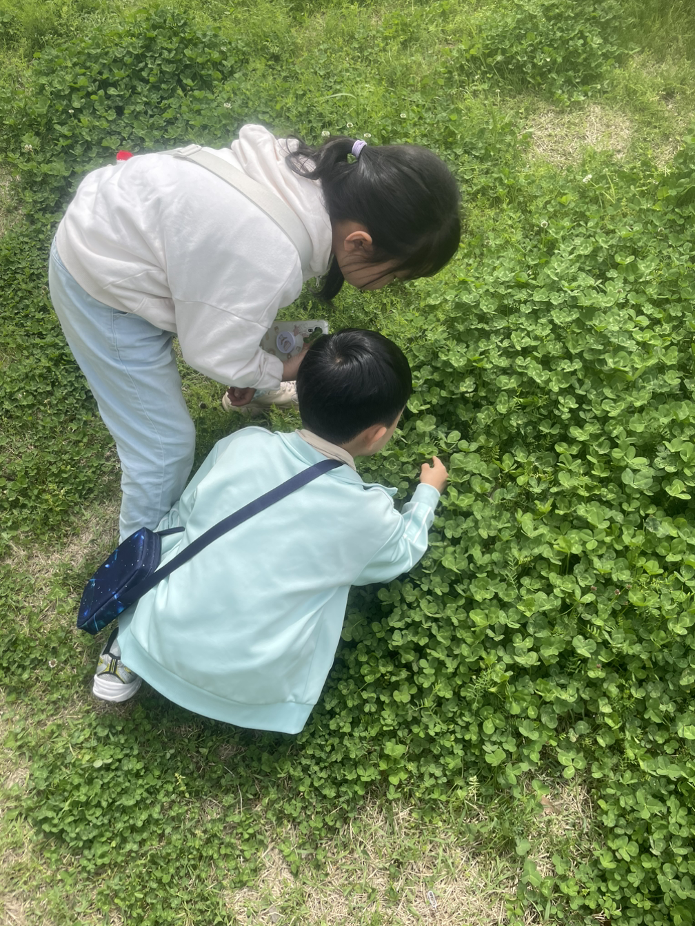 토끼 풀은 자세히 본 사람은 알겠지만 옆으로 기는줄기라서 한 줄기의 토끼풀이 있다면 금세 그 구역 전체가 토끼풀 밭이 되기 일쑤다. 그만큼 번식력이 강하다. 그래서 토끼풀이라고 하는지도 모르겠다. 토끼도 번식력이 강하다고 하니까. 하나의 네잎클로버를 보자 아이들의 눈빛이 바뀌었다.