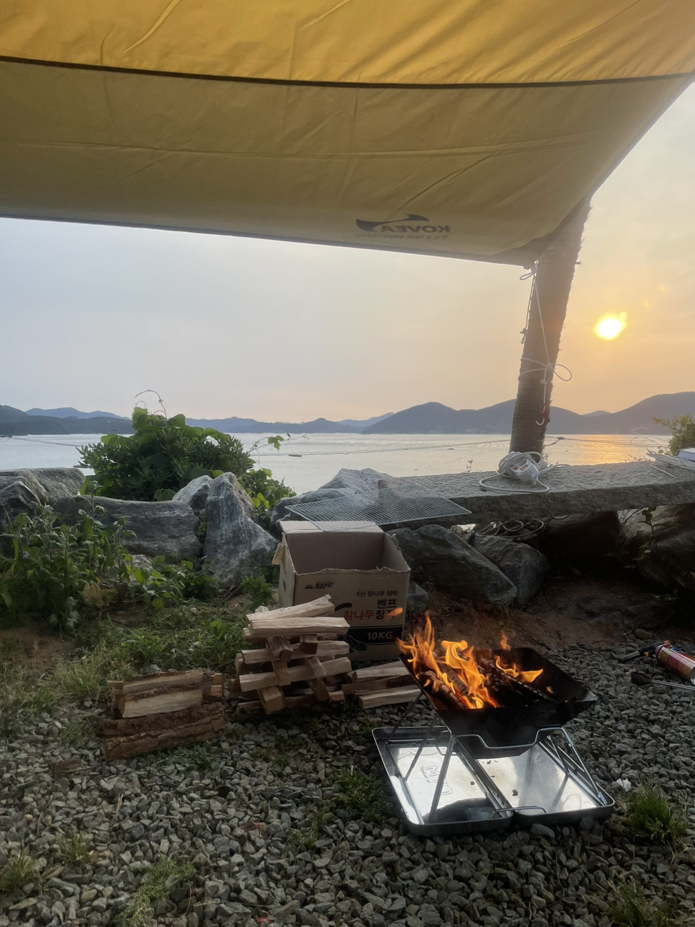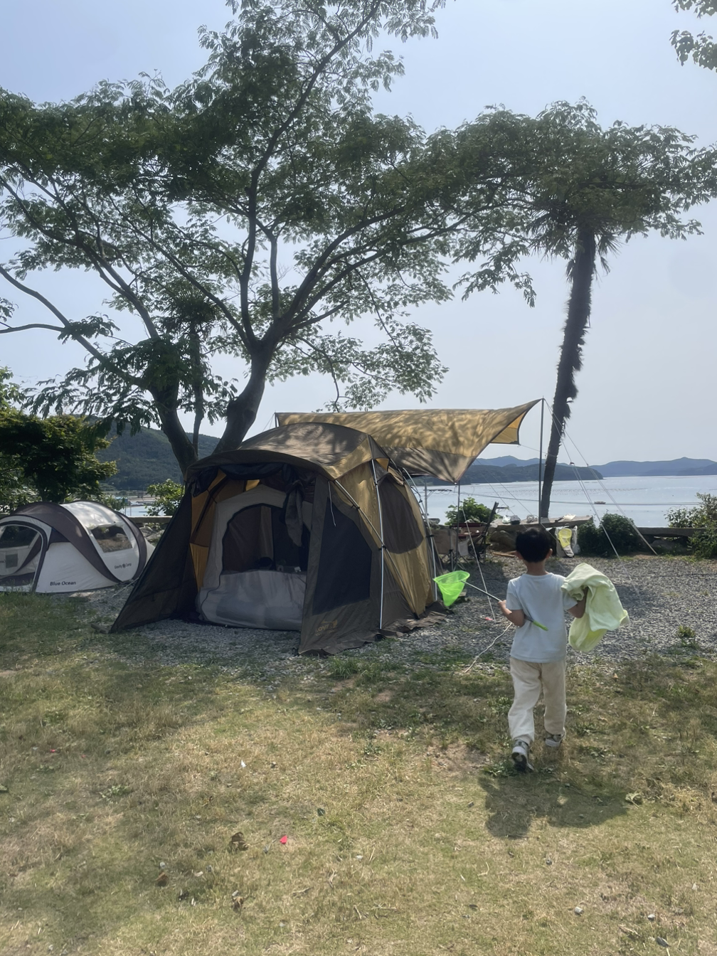 더운 날씨를 못 견뎌하는 남편과 첫째 덕분에 한여름 캠핑은 어림없고, 주로 가을, 아침저녁으로 선선할 때 캠핑을 갔다. 좋은 시설에 편리한 캠핑장 많겠지만 항상 찾는 곳은 거제 바다가 잘 보이는 옛 학교의 캠핑장이다. 다용도실에 잠자고 있던 캠핑 도구 챙기기가 제일 힘든 일인데 남편이 알아서 잘 챙긴다. 캠핑 자주 다니는 분들은 이것저것 신기한 장비들도 많던데 우리는 딱 십 년 전에 산 코베아 텐트와 도구들이 전부다. 그때 산 코펠이며, 식탁, 의자 10년이 다 지나도 망가진 것이 없고 1년에 많아야 한두 번 쓰기 때문인지 아직 멀쩡해서 잘 쓰고 있다. 다만 4 식구 한 텐트 안에서 자기엔 아이들도, 어른도 부피가 조금씩 늘어나서 원터치 텐트 하나를 더 사서 원래 있던 이너텐트 대신 썼다.