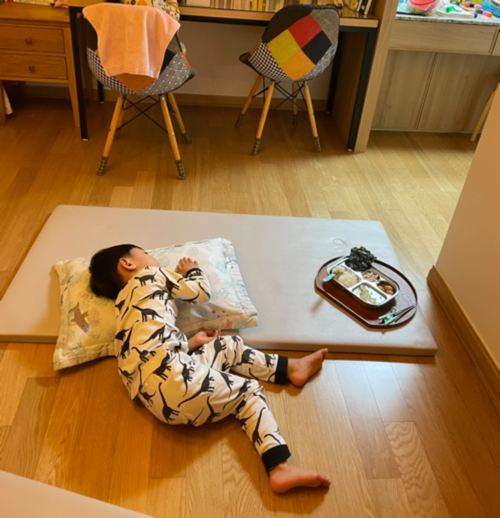아이는 잠이 늦게 드는 편이다. 일찍 이불에 누워도 베개를 만지작 거리고, 비비적거리면서 놀다가 잠이 들었다. 그게 내복, 토끼, 상어 베개였을 땐, 귀여웠지만 내가 베개가 되니 참을 수 없이 부드러웠다.