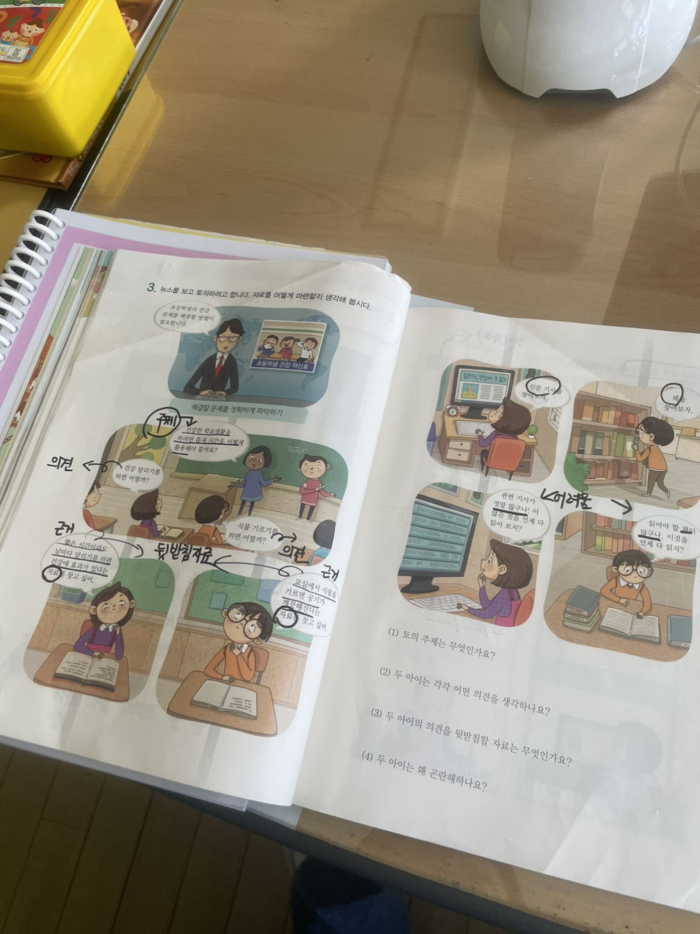 1교시 국어 수업 시간이었다. 오늘은 어제 배운 내용을 바탕으로 의견을 효과적으로 뒷받침할 수 있는 근거 자료에 어떤 것들이 있을지 공부했다. 학습 내용을 교과서로 정리하고, 토의를 할 참이었다.