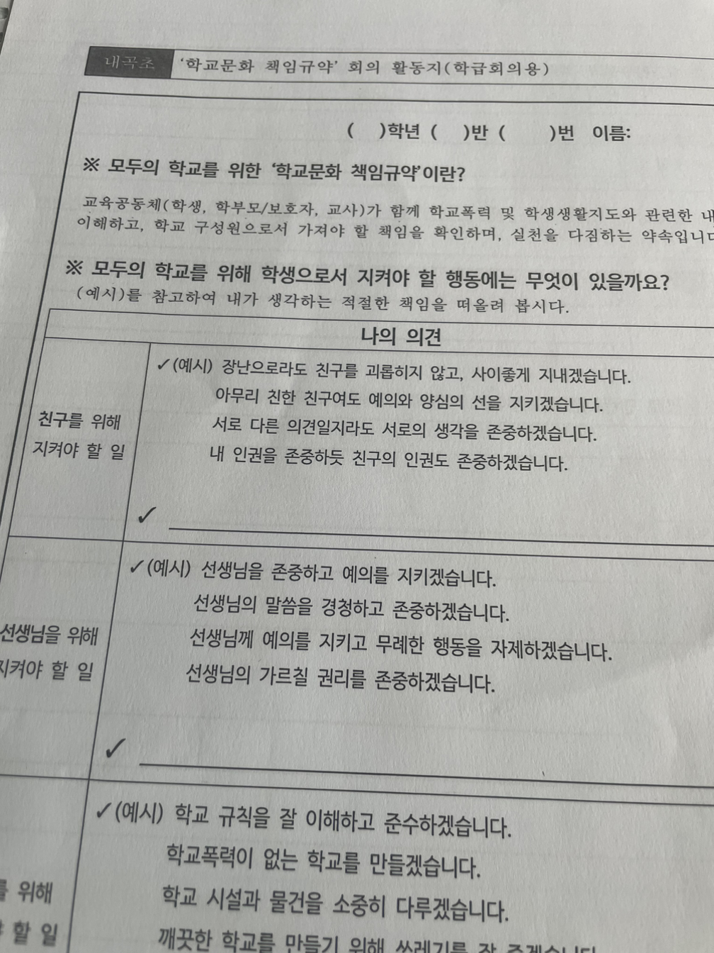 나 역시 이런 규약으로 인해 교육 3 주체 모두가 책임감과 실천 의지를 갖고 더 나은 학교를 만들고 교육 문화를 만들 수 있다면 좋겠다. 많은 선생님들의 바람일 것이다. 그래서 이미 학기 초부터 존중의 약속, 회복적 서클, 학급 다모임을 계속 실천하고 있다. 나또한 여러 가지 방법으로 학급을 운영하고 있지만 여전히 어려운 것이 생활지도다.