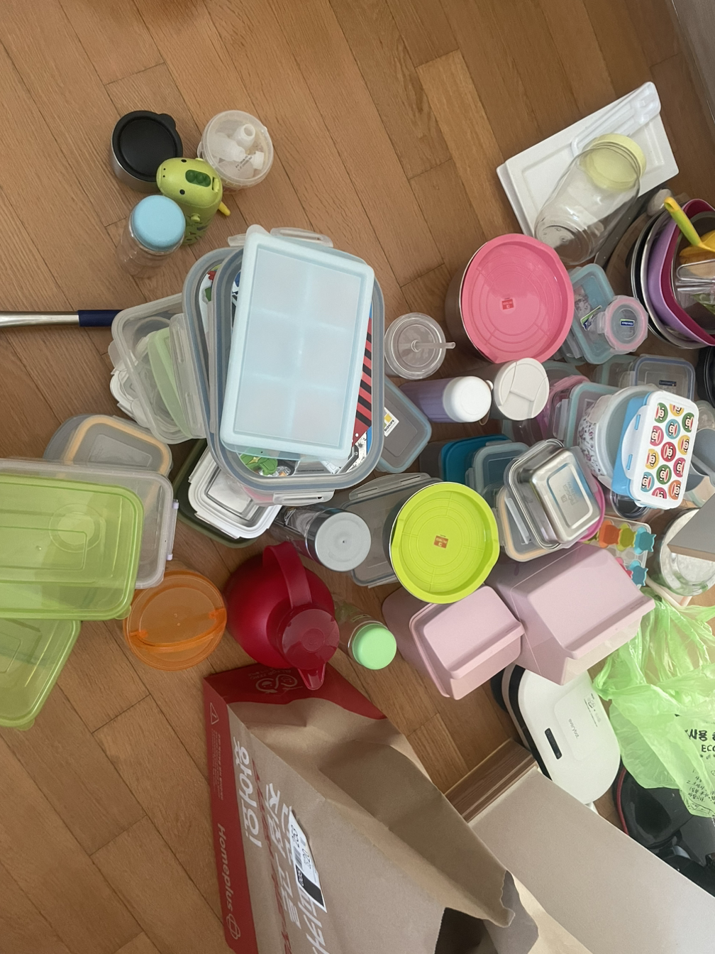몽땅 꺼내놓고 짝이 안 맞고, 오래된 것은 분리수거 통에 넣었다. 언제 쓸지 몰라 씻어둔 채 수납장에 넣었던 소스통, 잼병, 매실청 담갔던 커다란 유리병, 이유식 용기까지 협소해 보였던 싱크대 하부장이 사실은 블랙홀이었다. 끝도 없이 나오는 물건들에 부엌 바닥이 점령당해 버렸다.