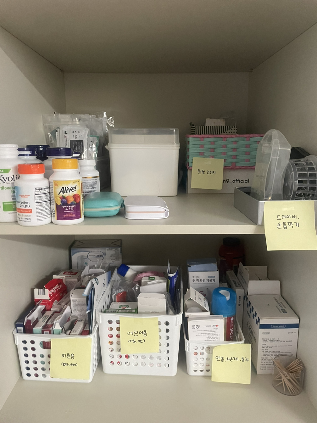 오전에 시작한 수납장 정리를 오후 늦게서야 마치고, 잘 놀고 있는 아이들을 불러 포스트잇에 각종 수납정리통에 이름을 붙이도록 시켰다.