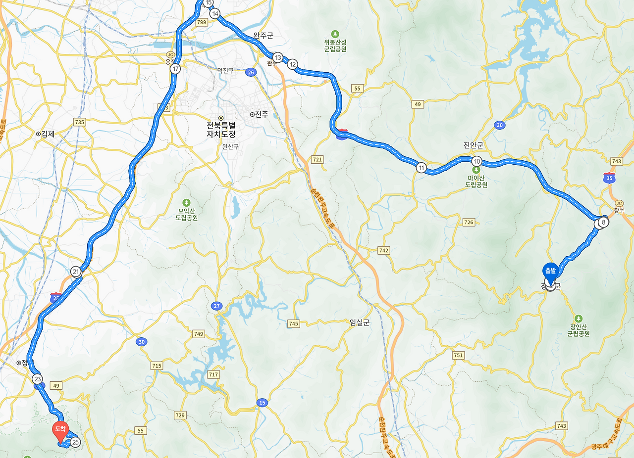 정읍으로 가는 길은 장수 - 진안 - 소양 - 삼례 - 전주 - 만경강 금산사 살짝 지나고 김제 - 태인을 거치면 된다. 아무리 직선거리지만 평일에 가는 거라 큰 차가 많았다. 아빠는 이 길을 양배추, 배추 싣고 광주 공판장에 다녀온 후 전주로 돌아올 때 많이 와봤다고 하셨다.
