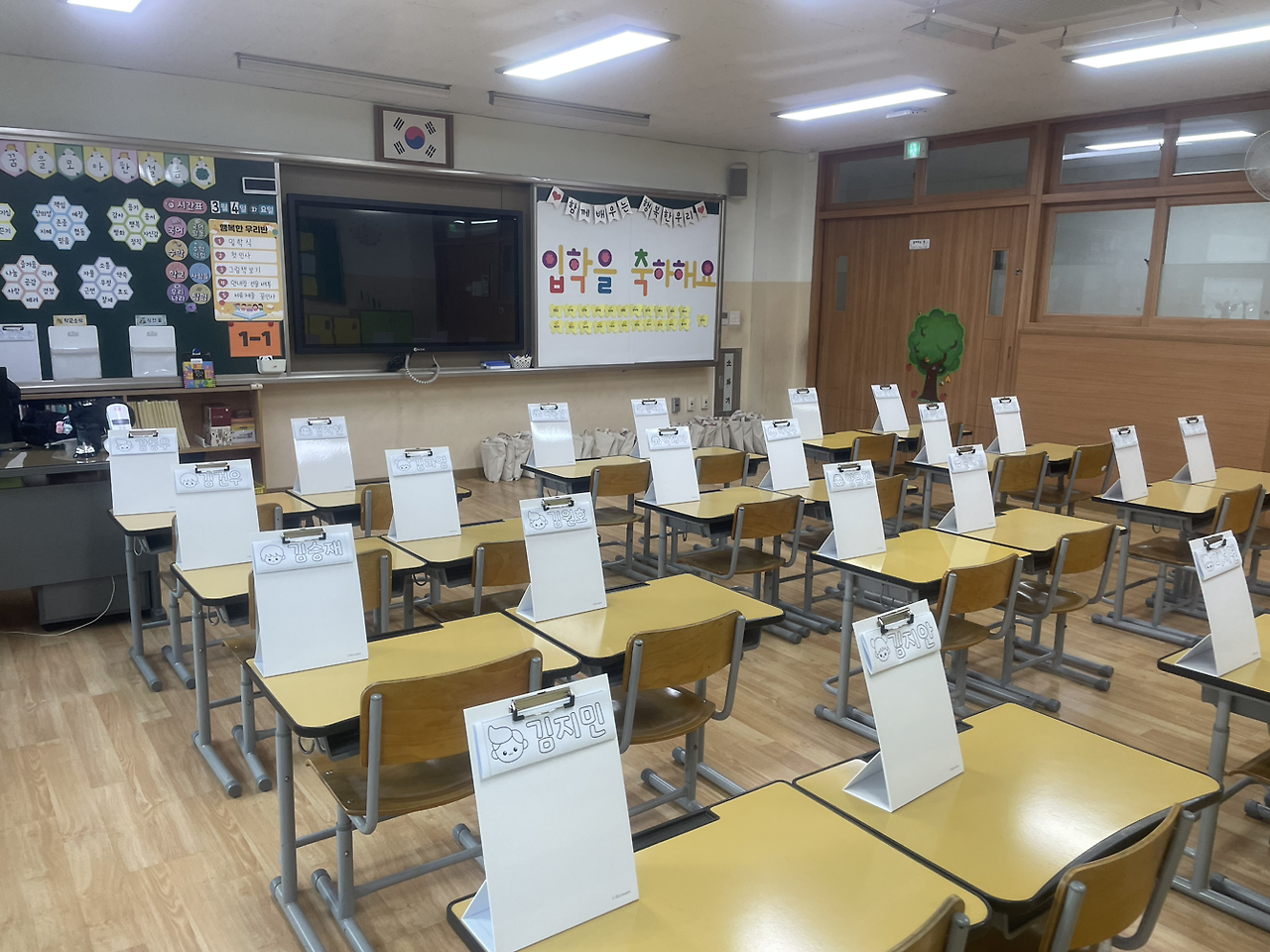 입학식엔 보이지 않았던 3명의 아이들도 교실로 이동했을 땐 도착해서 교실 안 빈 책상들이 아이들로 꽉 찼다. 아이들과 첫인사로 주어진 시간은 단 20분이다.