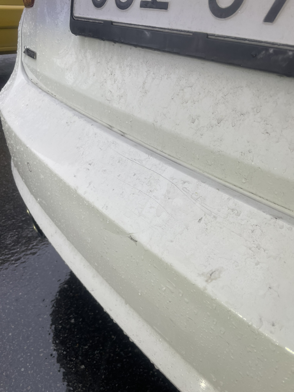 아이는 그냥 가라고 성화고, 나는 확인을 해야 한다면서 차에서 내렸다. 뒤 범퍼를 만져보니 확실히 움푹 파였고, 도장이 벗겨졌고 실금이 여러 개 난 것이 보였다.