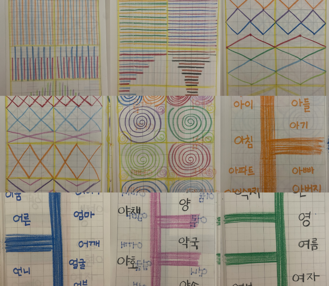1학년 입학초기 적응기간에도 아이들 손 힘을 기르기 위한 선긋기를 많이 하지만 본격적으로 국어 수업에 들어가도 바로 글자를 배우지 않고 선긋기를 먼저 한다.