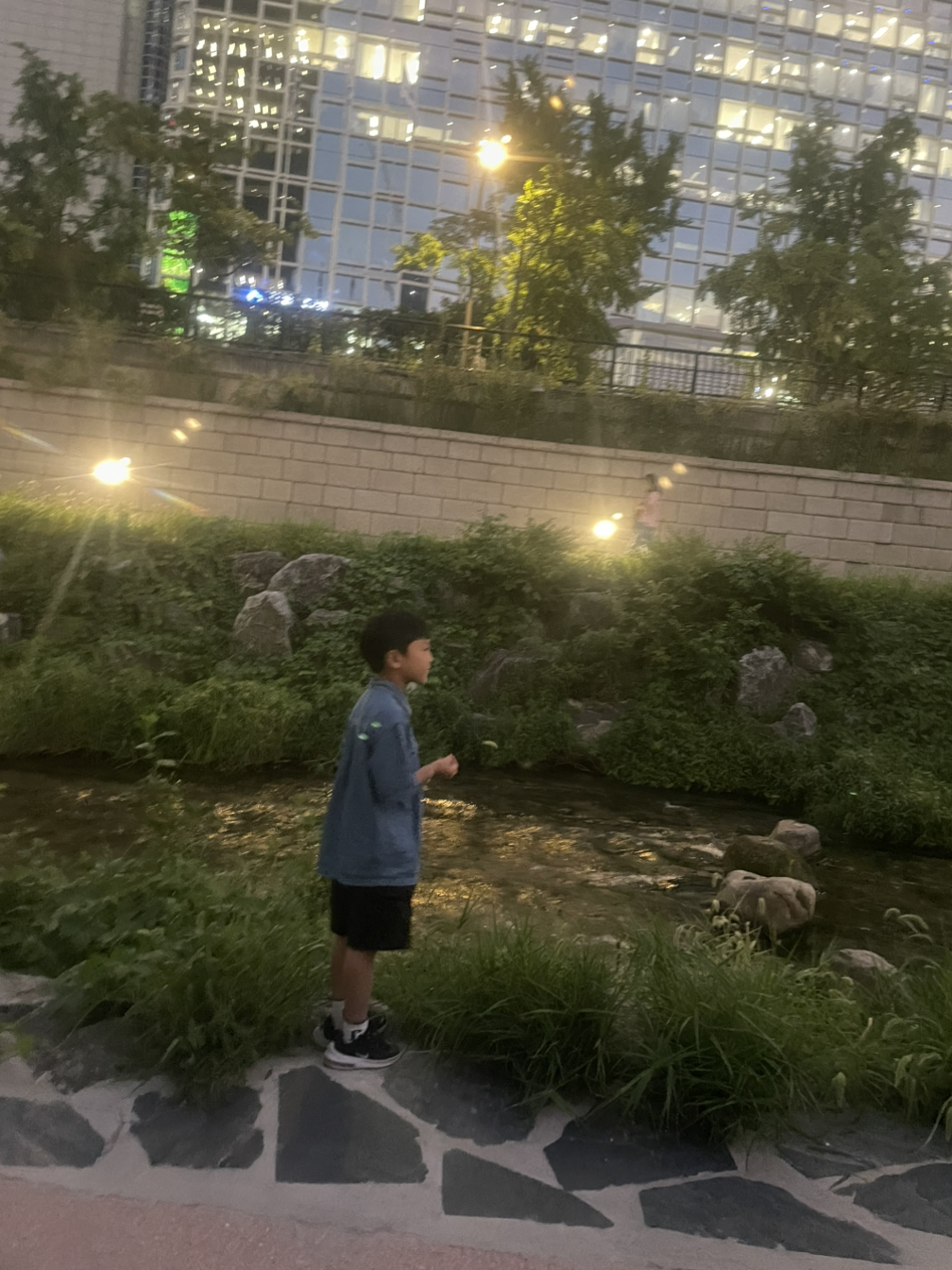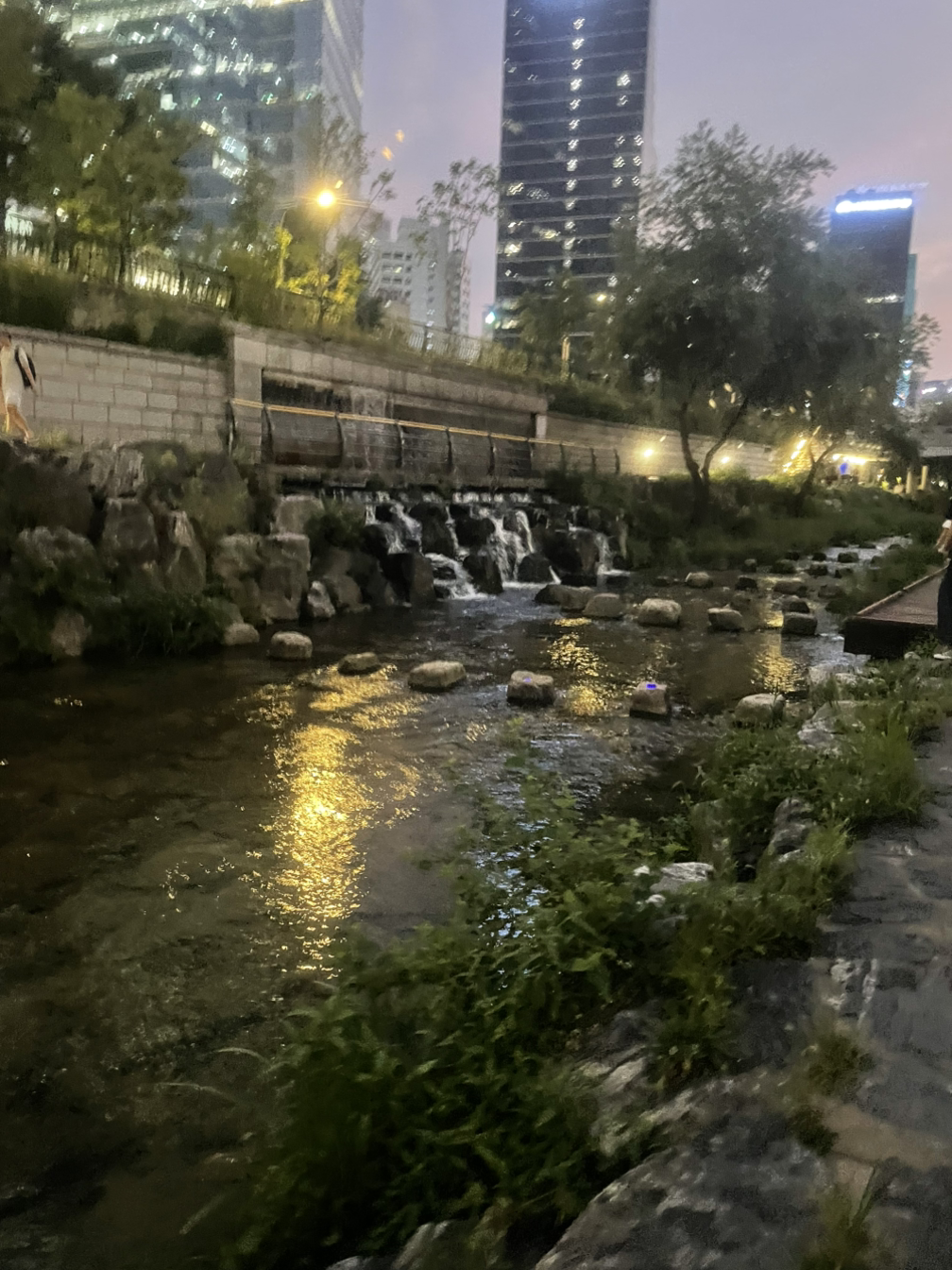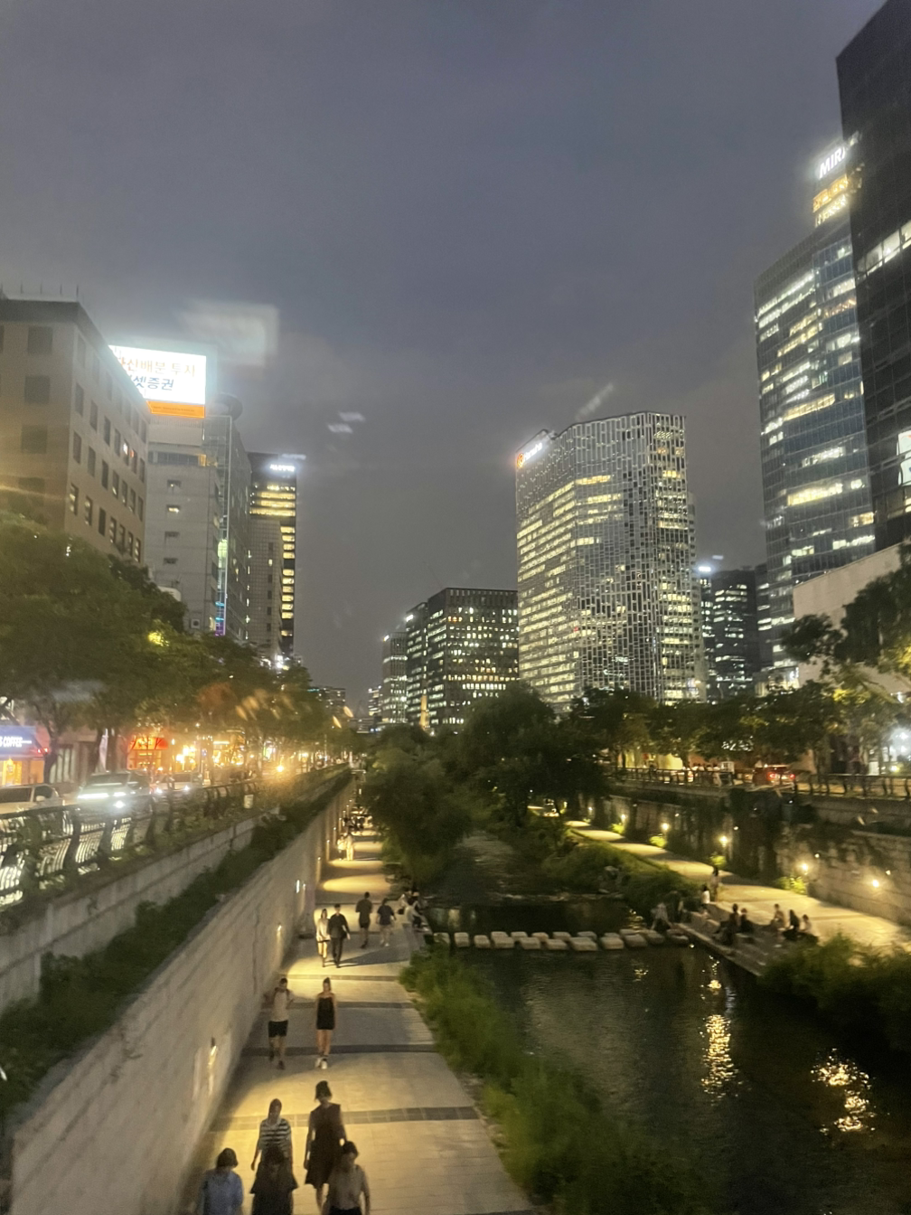 숙소에서 잠시 쉬고 저녁 먹을 겸 바깥을 나오니 아직은 여름밤이 확실했다. 청계천 산책로를 따라 천천히 걸으니 밤 산책을 즐기는 사람들이 많아 저녁보다 더 후덥지근했는데, 사실 그다지 향기롭지 못한 개울의 냄새 때문에 불편했다. 좁은 통행로에 걷는 사람, 뛰는 사람, 멈춰 사진을 찍는 사람, 개울에 발 담그는 사람 등 밤에도 붐비는 거리에 조금 고즈넉한 산책을 바랐지만 이루지 못하고 간단히 저녁을 먹고 돌아왔다.