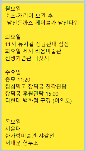 간호사 선생님 2분에 의사 선생님, 옆에 엄마까지 거르고 달래서 겨우 핀을 뽑고, 반깁스에서 단단한 통깁스로 바꿔 낀 아이는 아이언맨의 팔인양 깁스한 팔을 나름대로 활용하며 두 팔 생활을 하게 되었다. 팔깁스를 하고 있지만 안 한 것과 같은 활동량을 보였기에, 조금 고민했지만 물이 묻을 수 있는 곳을 모두 제외하고 서울 여행 코스를 짰다. 남편에게 여행 전날 보낸 일정은 당연히 변경가능한 유동적인 일정이었지만, 나름대로 아이 두 명의 니즈가 고스란히 들어간 계획이었다. 아들은 남산 타워를 꼭 가자했고, 딸은 쇼핑을 가자고 했다. 엄마는 종묘와 창덕궁을 원했고, 아빠는 시원한 실내를 원했으니까. 처음 세운 이 계획은 넷째 날 조금 변경된 것 외엔 거의 계획대로 움직였다.