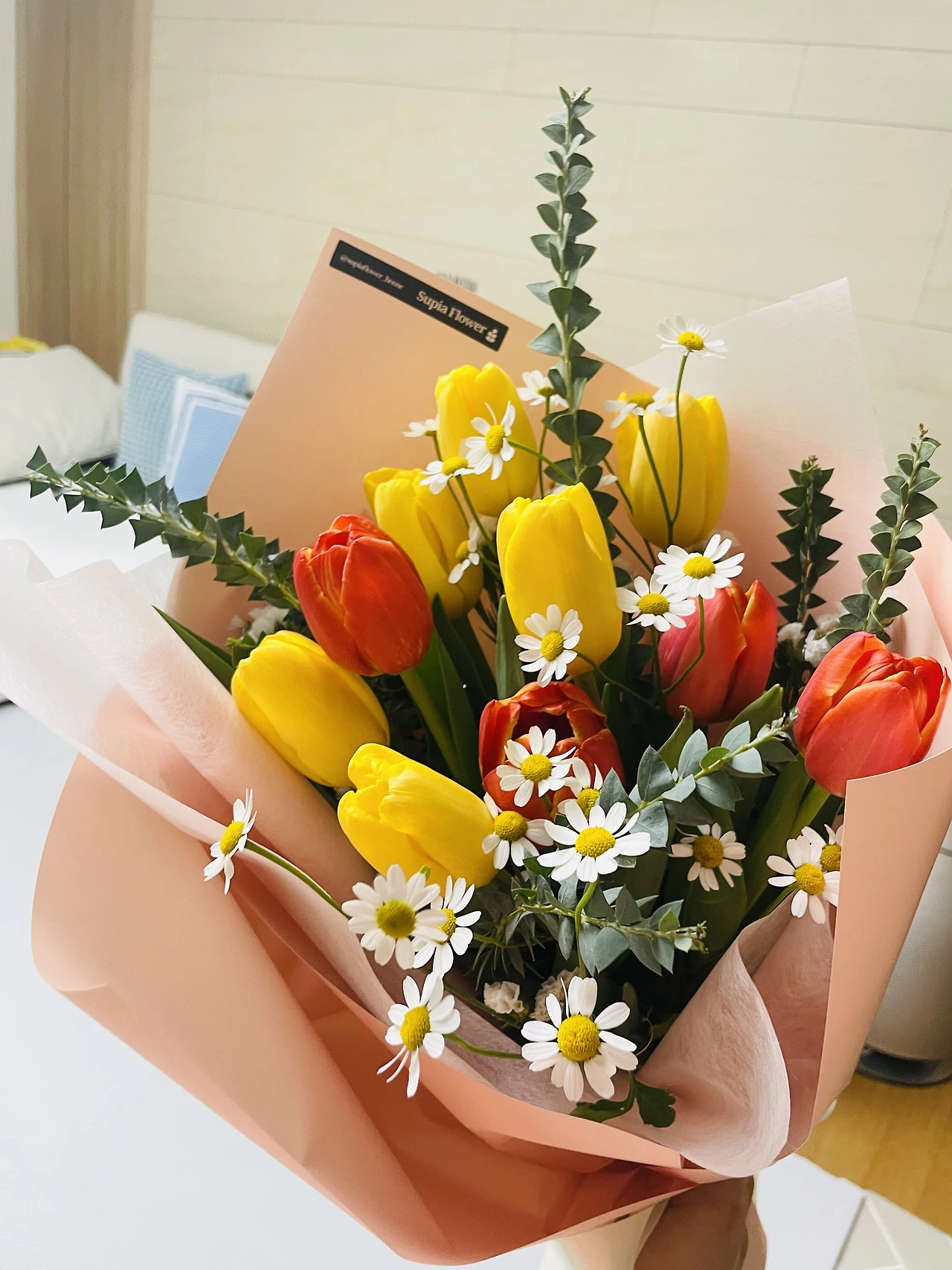 찡얼거리며 말을 하는 아들의 말을 적당히 무시하며 등굣길을 천천히 두드리며 걸어가는 발걸음도 사뿐했다. 교문 앞은 노점을 펼치며 꽃다발을 바삐 전시하는 상인들과 아이들이 뒤섞여 있었다. 지나가는 아이들의 손에도 어렵지 않게 꽃다발을 볼 수 있었다.