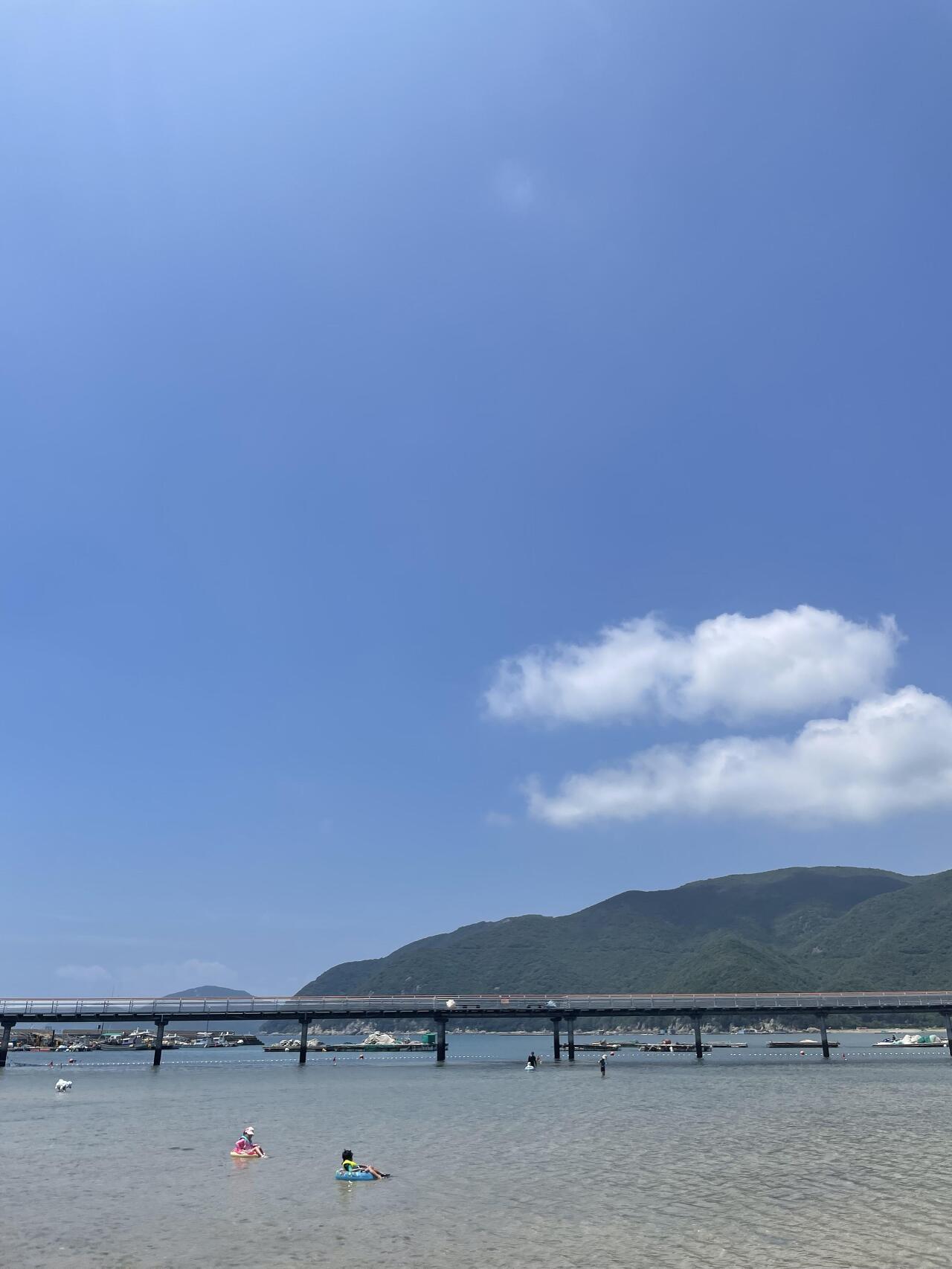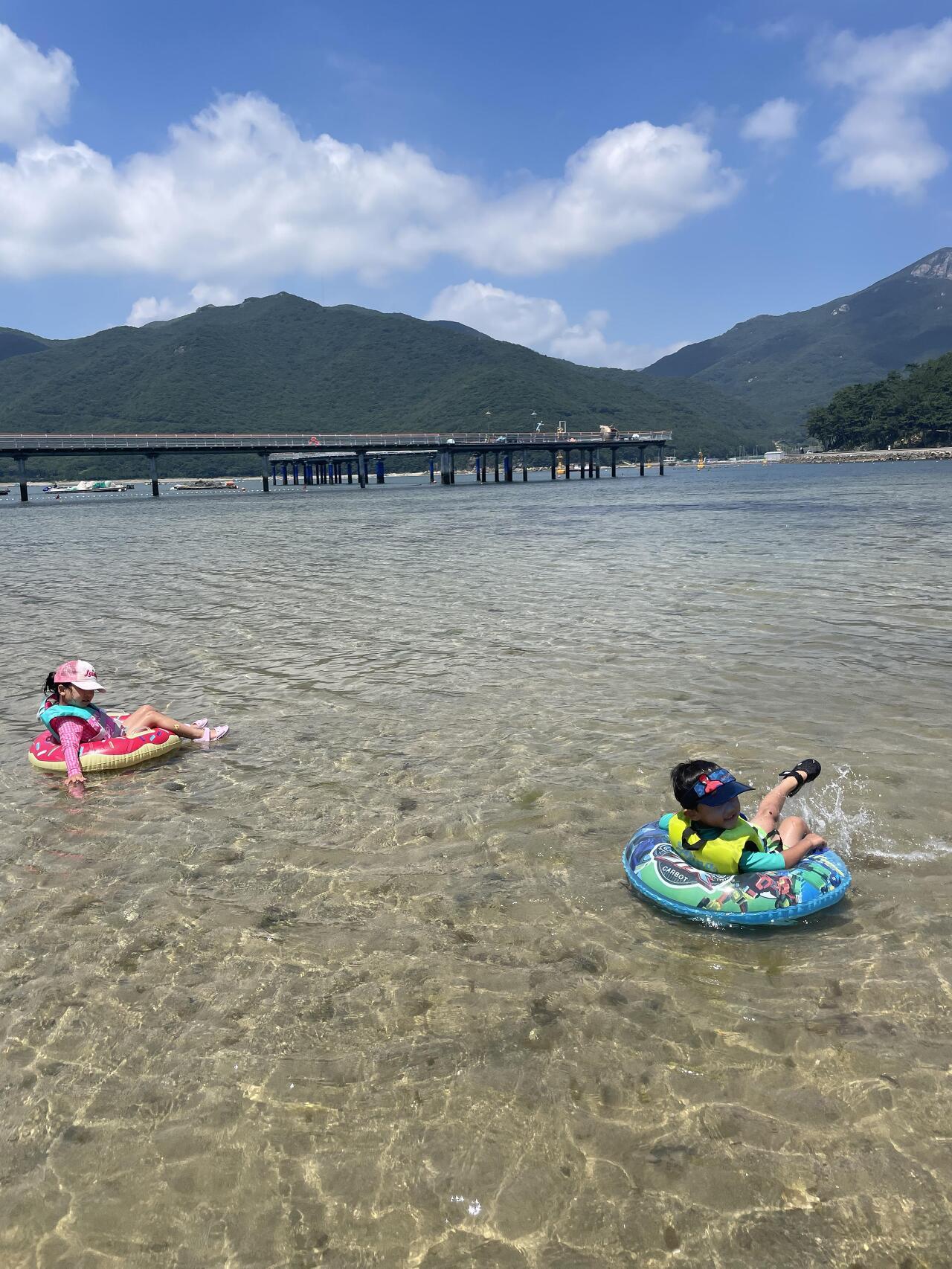 그런데 평소의 바다가 아니었다. 파도도 없고 녹조도 없고 겨우 종아리에 찰랑거릴 정도의 낮은 수위의 바다였다. 아이들은 기껏 바람을 넣은 튜브 위에서 물장구도 칠 수 없을 정도로 낮은 바다라 조금 시시했는지 튜브를 끌어달라고 성화다. 두 아이의 튜브를 양손에 잡고 바다 여기저기를 돌아다녔다. 얕은 곳을 조금만 벗어나도 종아리로 느껴지는 수풀의 느낌이 과히 좋았다. 고작 몇 걸음에 수온이 달라지는 것도 신기했다.